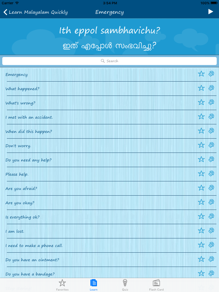 If you are determined to learn a specific category of words, Learn Malayalam Quickly will enable you that. It provides Malayalam translation for most frequently used words and phrases across 33 categories. You can use it like an English to Malayalam dictionary for 1100+ Malayalam words and Malayalam phrases. It’s indeed a great handy tool that will get you talking conversational language fast.