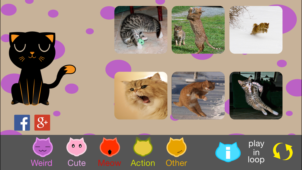 Choose your favorite cat from several categories: action, weird, cute, meow, and other. Click loop and you can listen to the sound all the time.