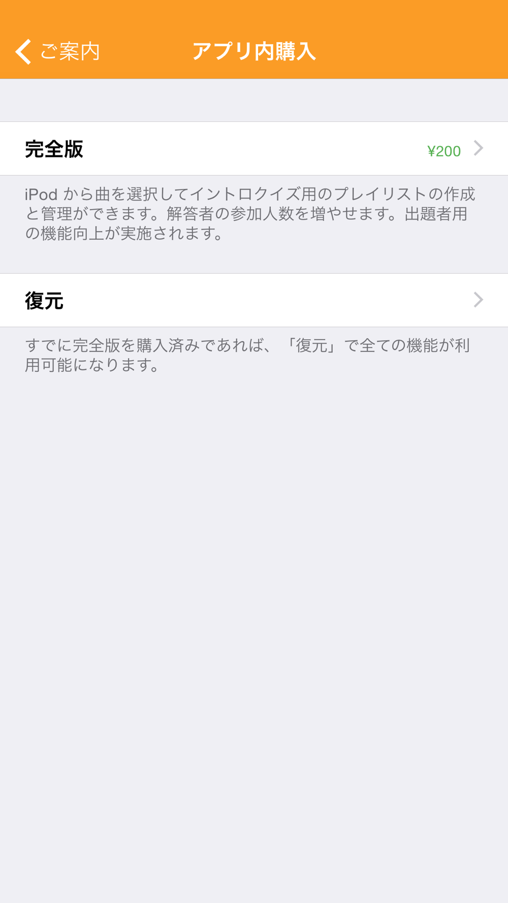 アプリ内購入で入手可能な完全版(有料)は、イントロクイズ用のプレイリストの作成と管理する機能が提供されます。