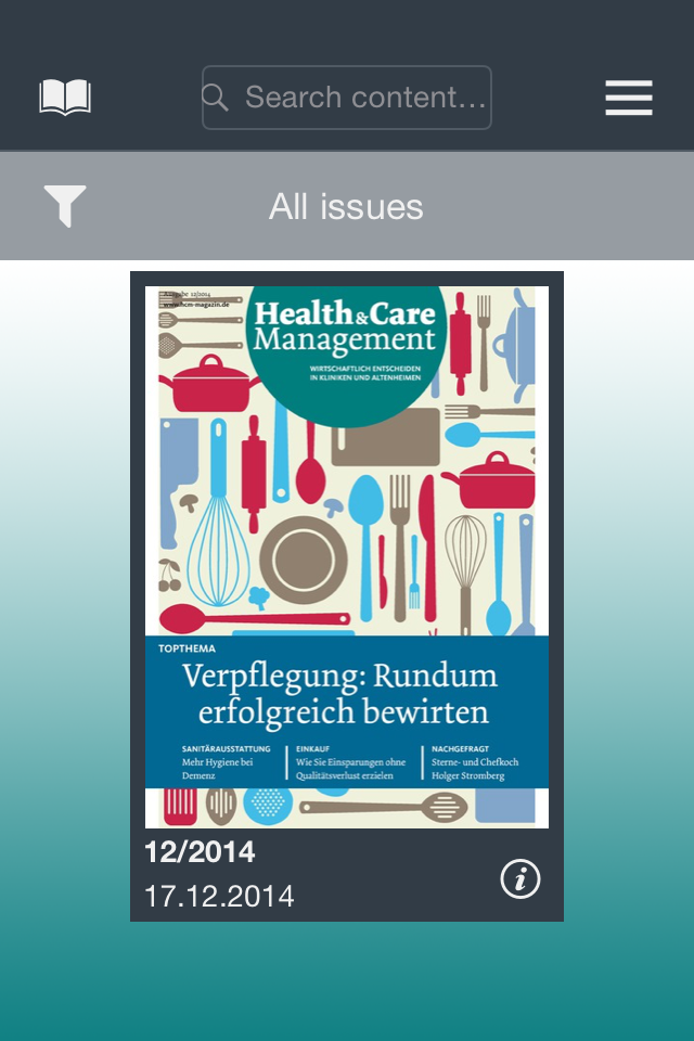 Health&Care Management ist das branchen- und bereichsübergreifende Fachmagazin für Entscheider in Krankenhäusern, Privatkliniken, Alten-/Pflegeheimen und sonstigen Einrichtungen im Gesundheitswesen. Health&Care Management bietet Ihnen praxisorientierte Arbeitshilfen und crossmediale Lösungen für Entscheider und Meinungsführer im Gesundheitswesen. Neben Meldungen rund um Management, Finanzen, Personalführung, Recht und Steuern stehen Gebäudeoptimierung, Einrichtung, Informations- und Kommunikationstechnik, Medizintechnik, Qualitätsmanagement, Marketing und Logistik im Fokus. Managementfragen werden mit Anwenderberichten und Handreichungen für die Organisation im Gesundheitsmarkt aufbereitet. Mit konkreten Arbeitshilfen wird wertvolles Wissen in Anleitungen umgesetzt. Entdecken Sie nun die neue App der Zeitschrift und lesen Sie das Fachmagazin pünktlich zum Erscheinen der jeweiligen Printausgaben auf Ihrem iPad. Bleiben Sie immer auf dem Laufenden – mit der neuen App von Health&Care Management.