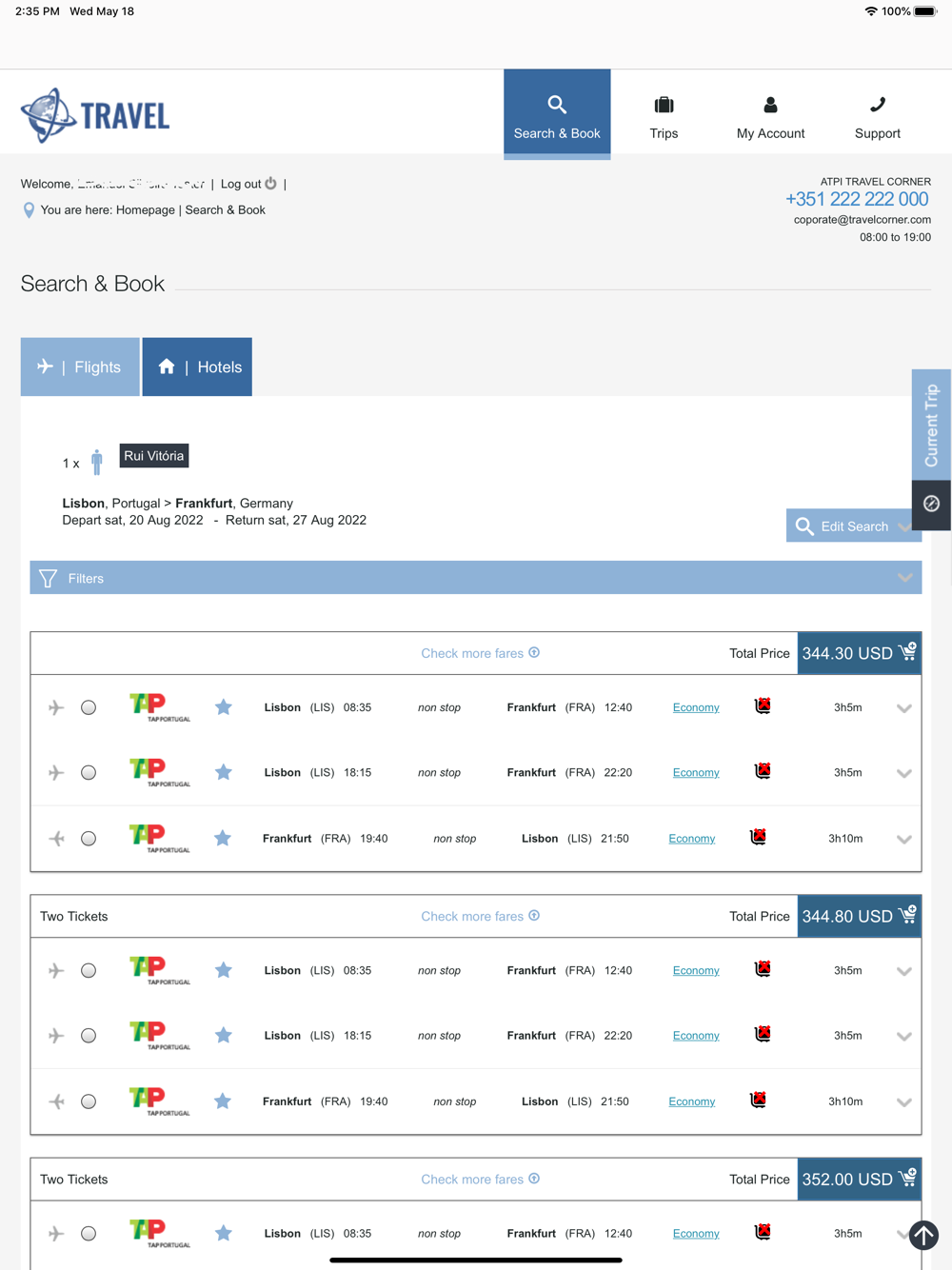 Search results are validated according with each traveller travel policy and out-of-policy results are highlighted on screen to alert the user. Travellers' out-of-policy products if added to the trip are marked accordingly during all the booking process.
