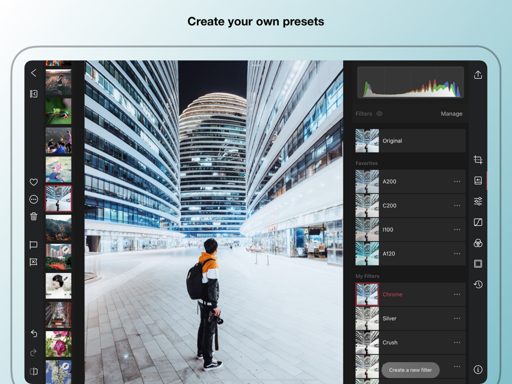 Embrace boundless creativity with touch-responsive curves and selective color tools, streamlining your editing process while fostering the creation of unique presets. Revel in the full glory of your RAW photos with full-resolution editing and 16-bit color depth, capturing every nuanced detail, shadow, and highlight.