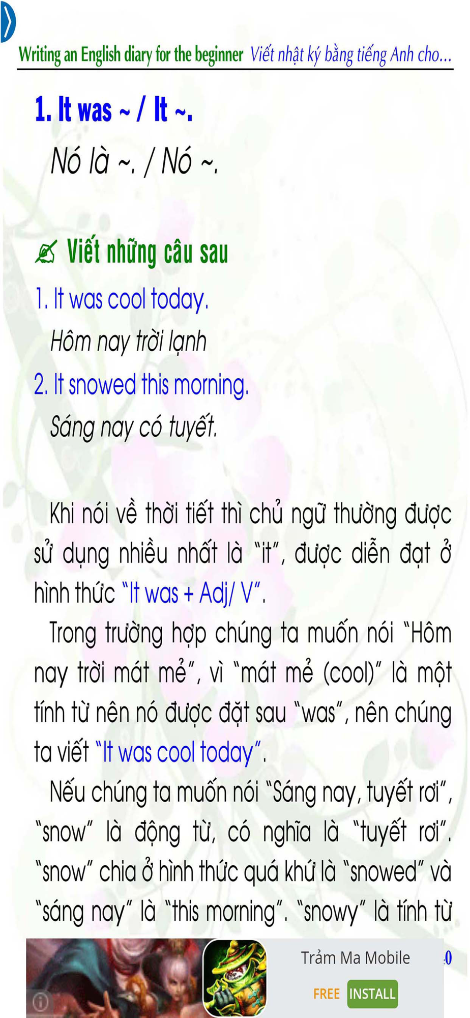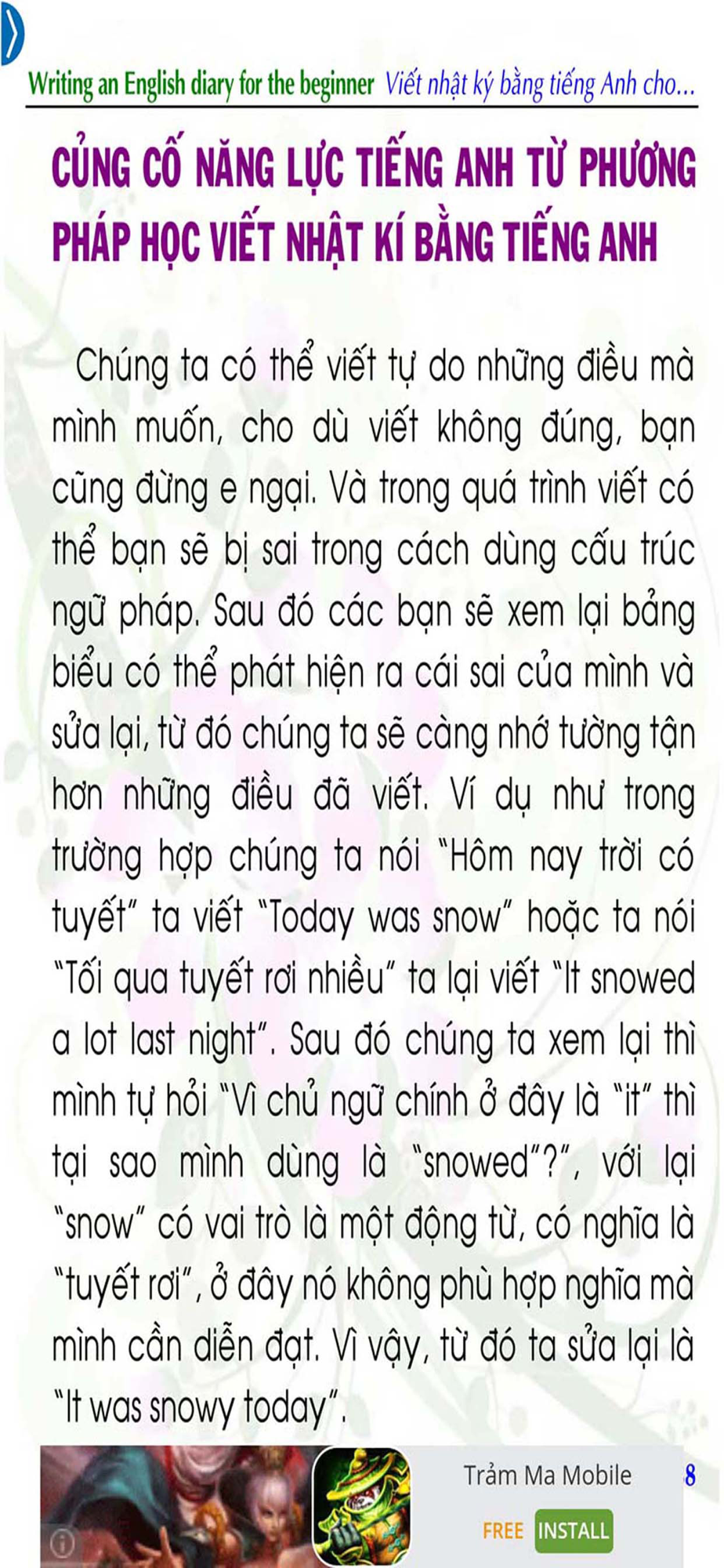 Quyển sách này nêu ra những mẫu ví dụ phong phú, những đoạn văn tiếng Anh trong thực tế đời sống về việc viết nhật ký. Ngoài ra, trong những ví dụ đó, chúng tôi có giải thích rõ ràng, mạch lạc, dễ hiểu để mọi người có thể tiếp thu nhanh hơn.
