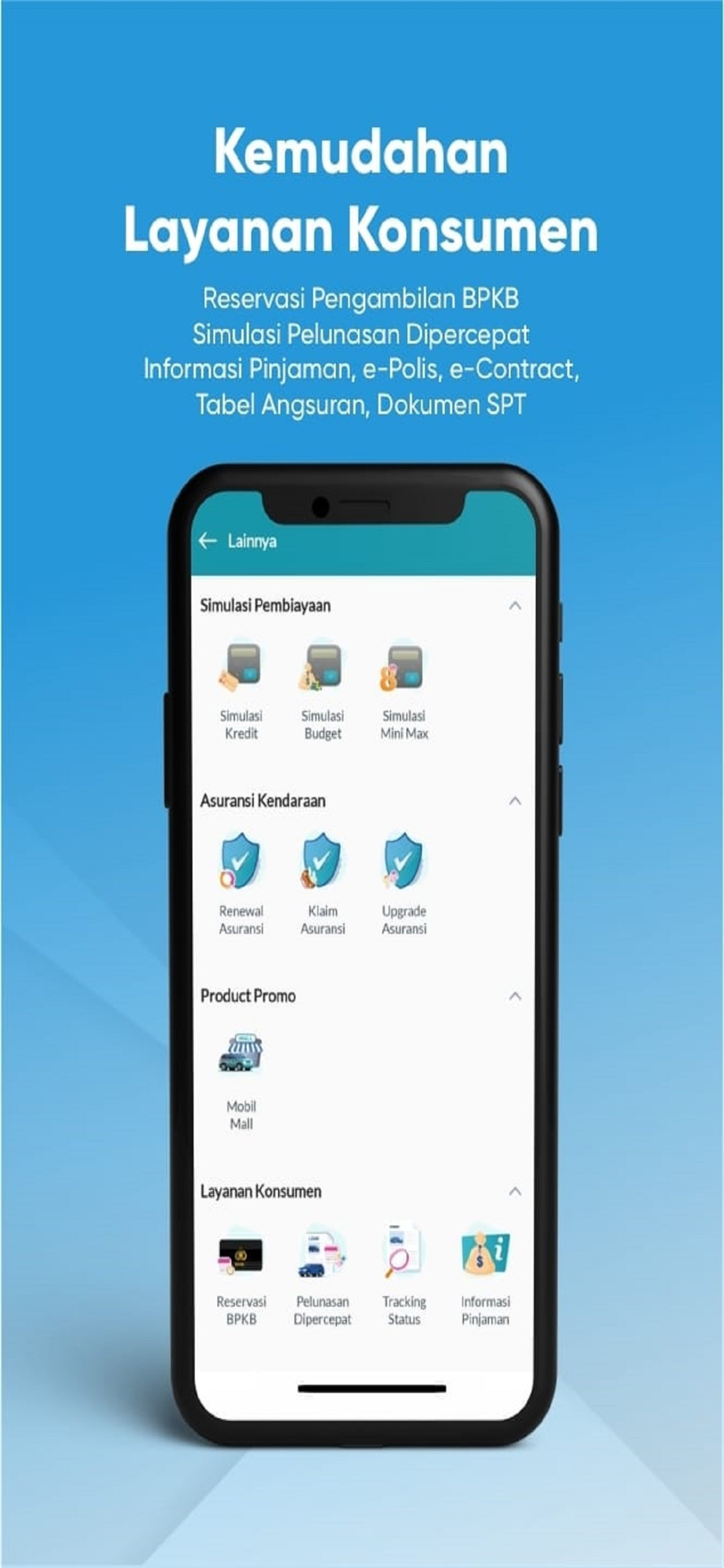 3.Layanan konsumen sesuai kebutuhan Anda, seperti informasi pelanggan, simulasi pelunasan dipercepat, reservasi pengambilan BPKB tanpa harus antri terlebih dahulu.
