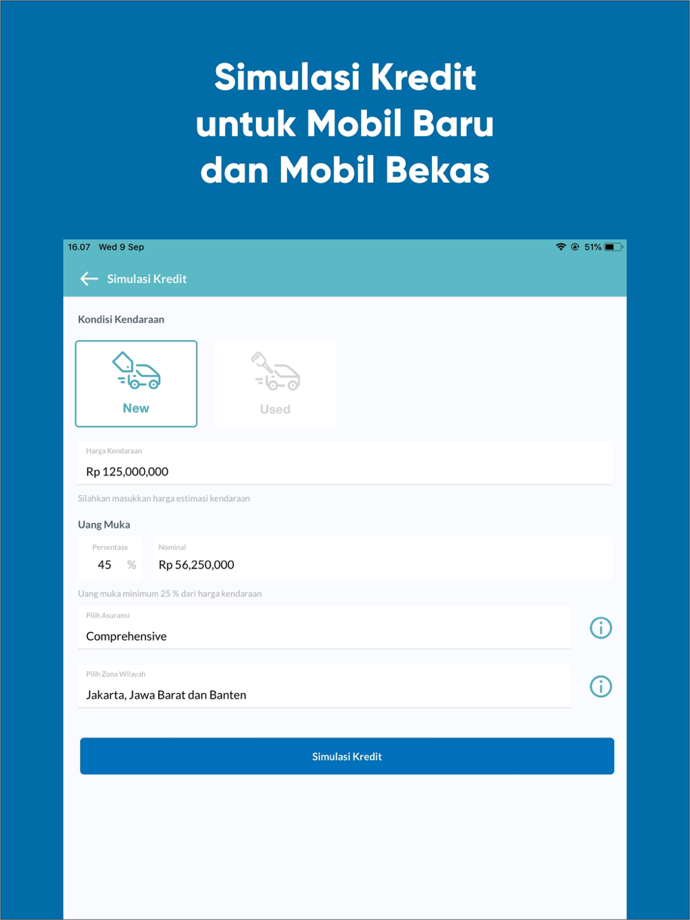 1.Simulasi kredit mobil baru dan bekas berdasarkan budget total pembayaran pertama ataupun angsuran.
