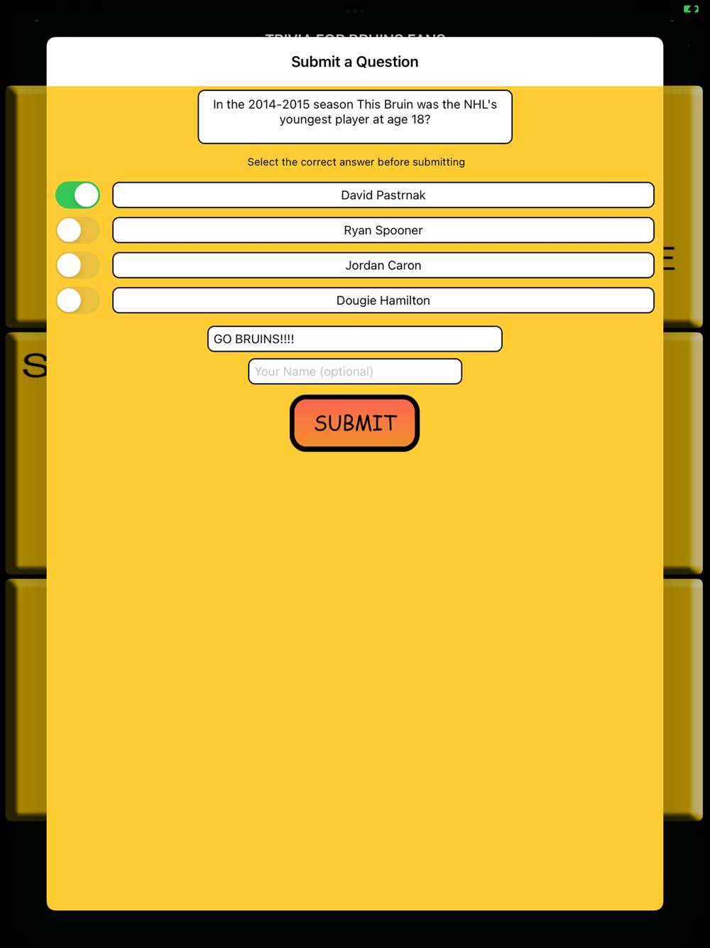 This app is a fun Trivia Game and Schedule for Die Hard Bruins fans! This app tests the users knowledge of Bruins hockey. We have hundreds of really cool and challenging questions about the Bruins. If you like the Bruins, you'll love this app! You can also send in your own Bruins Trivia question and we will put it in the database with (optionally) your name on it.