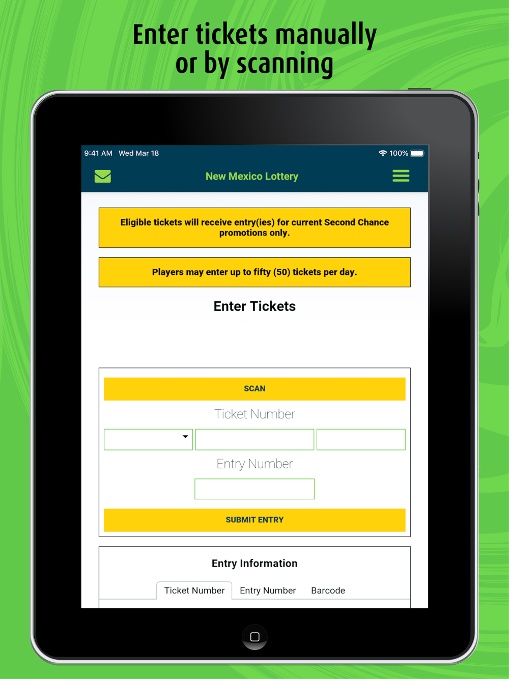 This official "Play Again" app from the New Mexico Lottery offers players a quick and convenient way to scan eligible New Mexico Lottery tickets into My Rewards second-chance drawings.