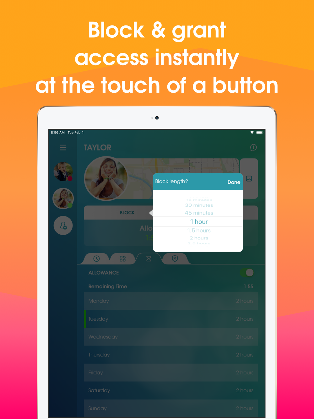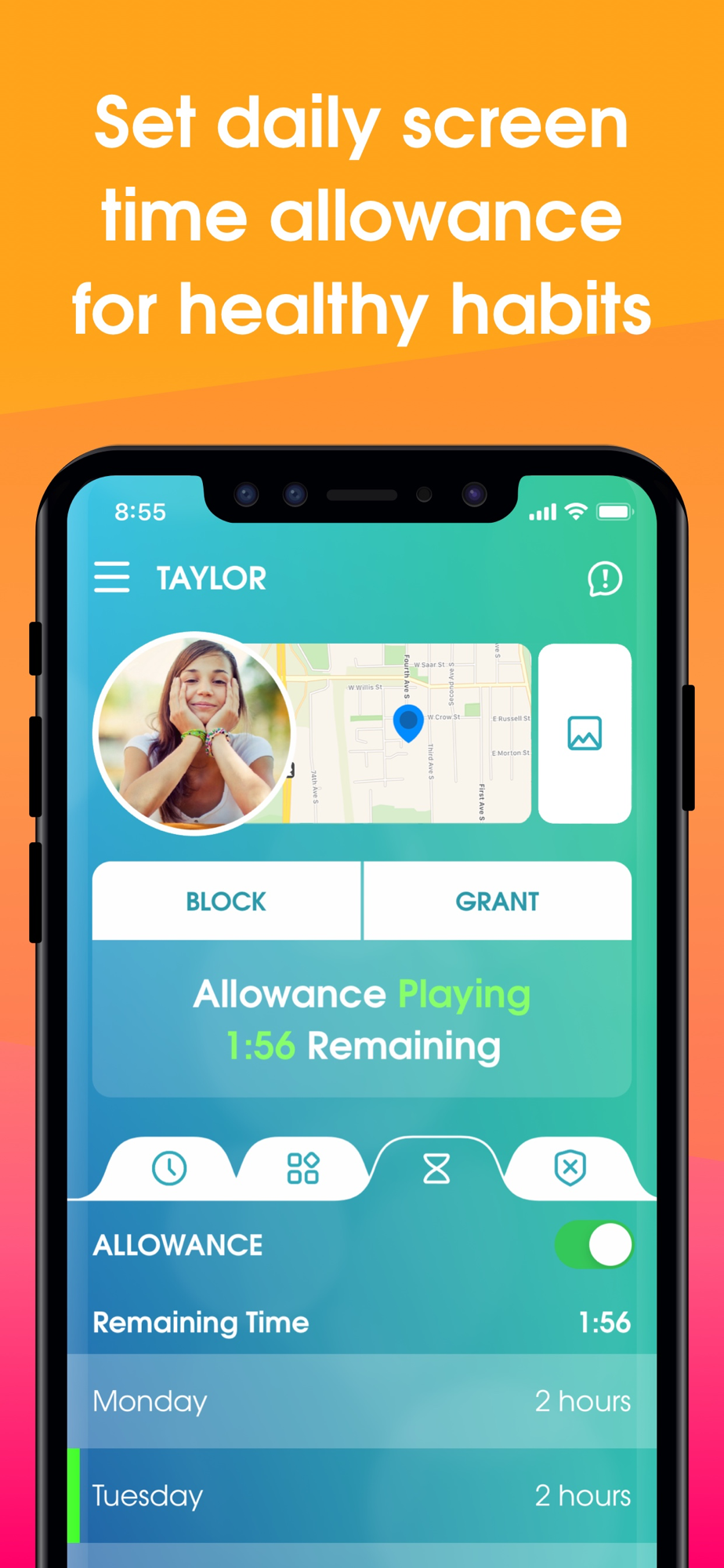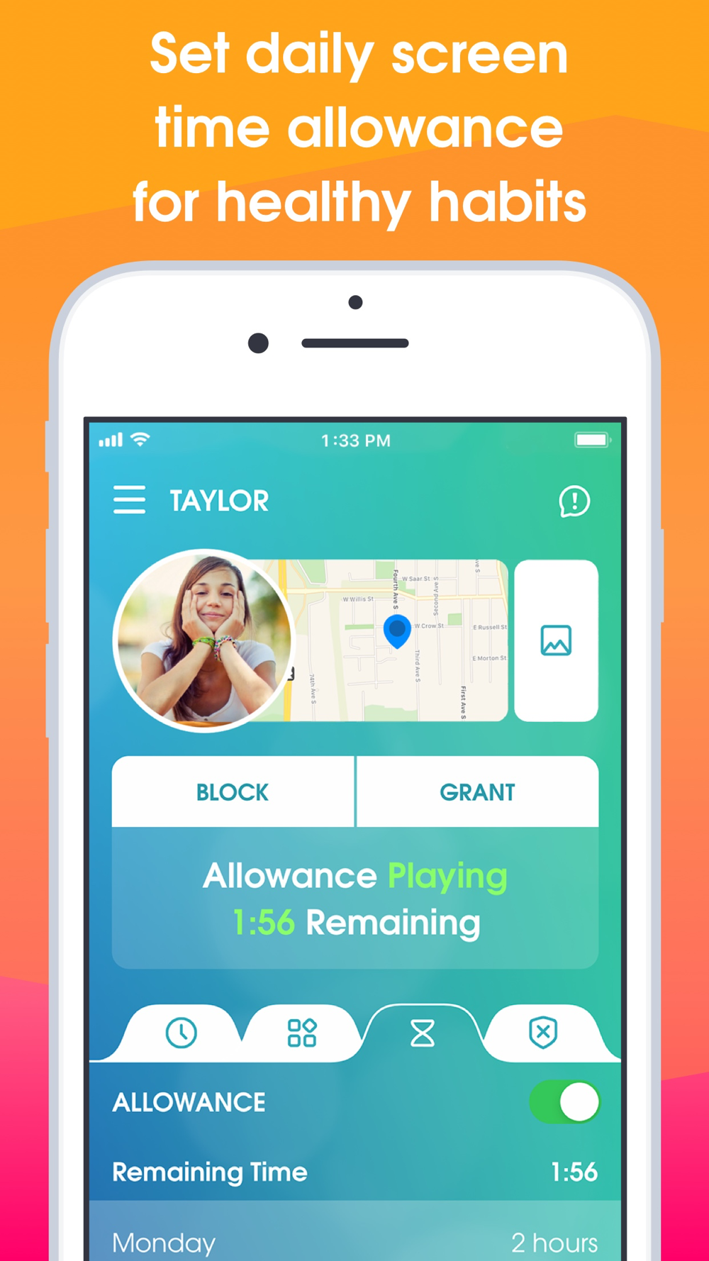 • Screen Time Allowance – Set daily screen time limits for your kids