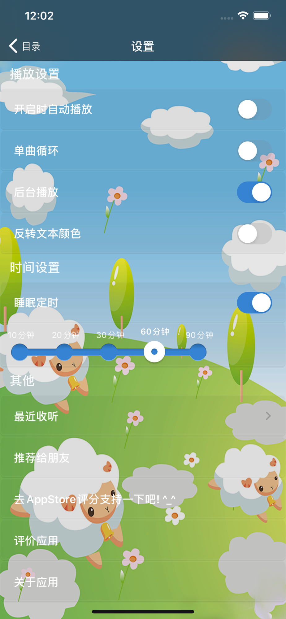 4.睡眠定时:设定自动关闭播放时间,时长从5分钟到3小时,到时自动关闭播放。