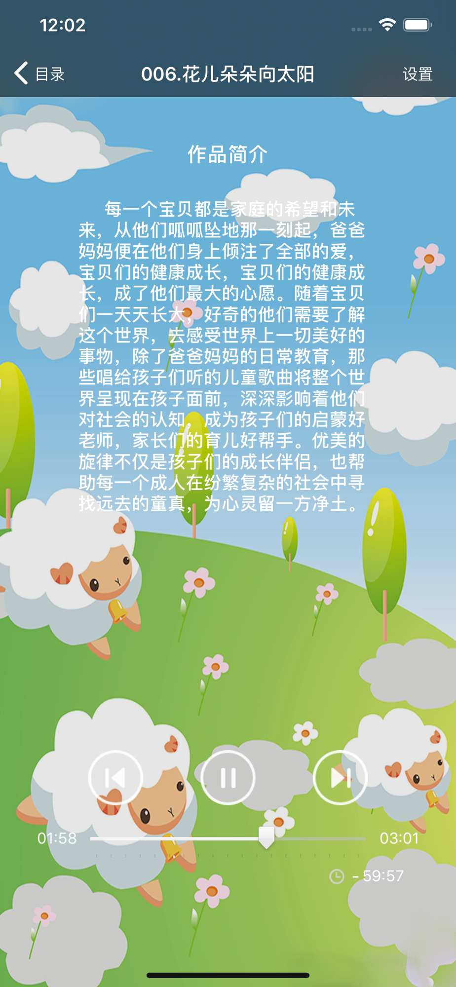 每一个宝贝都是家庭的希望和未来,从他们呱呱坠地那一刻起,爸爸妈妈便在他们身上倾注了全部的爱,宝贝们的健康成长,宝贝们的健康成长,成了他们最大的心愿。随着宝贝们一天天长大,好奇的他们需要了解这个世界,去感受世界上一切美好的事物,除了爸爸妈妈的日常教育,那些唱给孩子们听的儿童歌曲将整个世界呈现在孩子面前,深深影响着他们对社会的认知,成为孩子们的启蒙好老师,家长们的育儿好帮手。优美的旋律不仅是孩子们的成长伴侣,也帮助每一个成人在纷繁复杂的社会中寻找远去的童真,为心灵留一方净土。