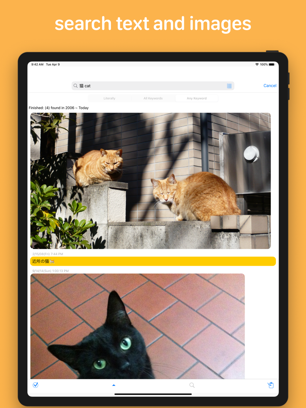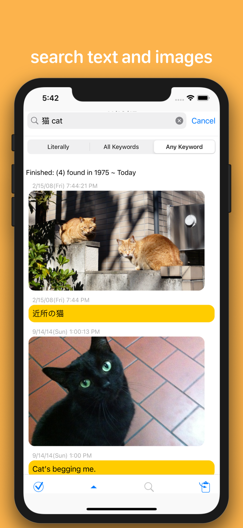 View all the photos, notes and events in a timeline. Use the app as your private journal.