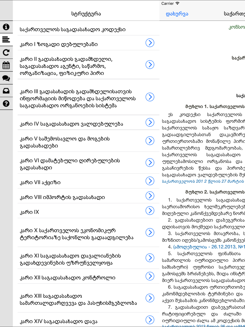 The Legislative Herald of Georgia (‘Matsne’) is a legal entity under public law (LEPL) within the governance of the Ministry of Justice of Georgia. ‘Matsne’ offers almost a complete database of Georgian primary and secondary legislation. Users can access any consolidated normative act, including the history of changes at any stage, also can make comments and add documents to favorites for offline viewing.