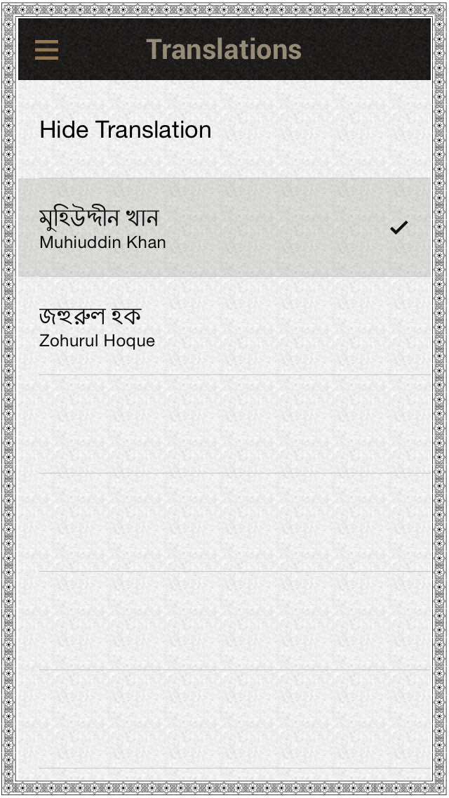 • Quran-Bengali the ultimate translation of Quran in Bengali language (Muhiuddin Khan and Zohurul Hoque) and audio recitation from trusted sources. One application after which you do not need to download any other Quran App for Bengali translation.