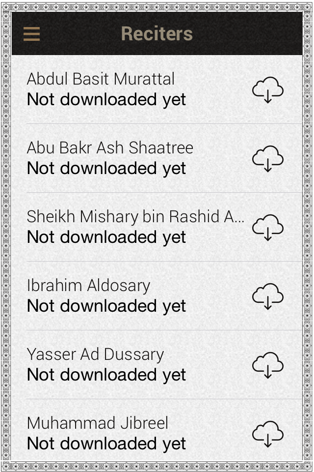 • Complete list of reciters is Hedayatfar, Kabiri, Ibrahim Walk, Shamshad Ali Khan, Abdul Basit Murattal n Mujawwad, Abu Bakr Ash Shaatree, Sheikh Mishary bin Rashid Alafasy, Ibrahim Aldosary, Yasser Ad Dussary, Muhammad Jibreel, Muhsin Al Qasim, Shahriar Parhizgar, Salaah Abdul Rahman Bukhatir, Salah Al Budair, Saood ash Shuraym, Warsh Yassin al Jazaery, Abdullah Basfar, Ahmed Neana, Abdur Rahmaan As Sudais and more.