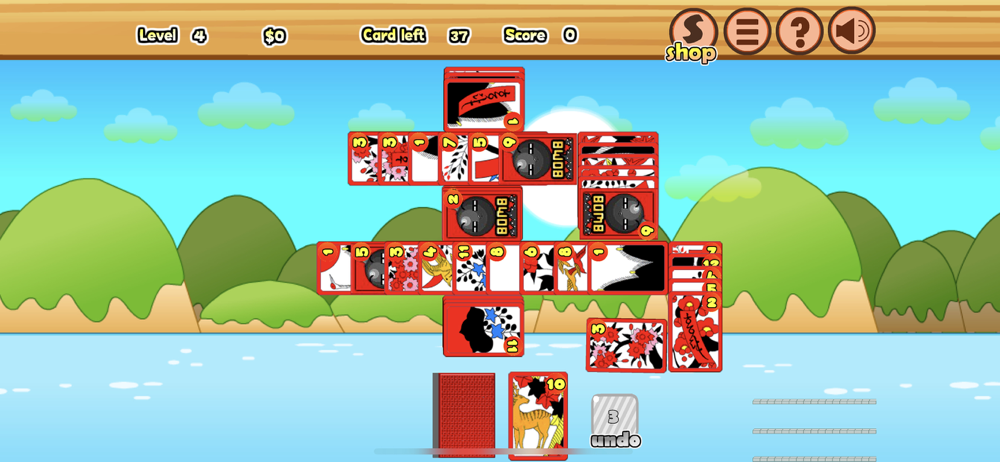 Clear all the cards from the board! Eliminate one card from the screen pile by tapping the number higher or lower than the number shown at the bottom of the screen. The cards that are left on the screen determine your score and the number of stars you will receive. No cards left gives 3 stars, 1 card left gives 2 stars, and 2 cards left gives 1 star, if neither of those, you have to try again! Make good use of the bombs to change the order of the numbers when you're in a pinch. You cannot undo the usage of the bombs so be careful!