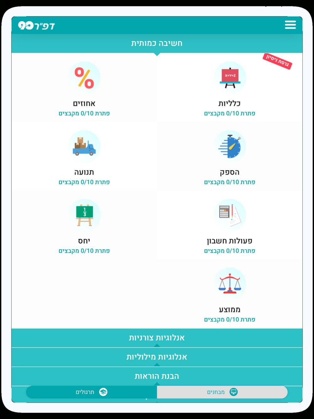 - מבחנים ותרגולים פסיכוטכנים לצו ראשון בחינם ובתשלום לתלמידים המעוניינים בהכנה מקיפה יותר לצו ראשון. מעל 1600 תרגילים ושאלות, עשרות מבחנים וסימולציות.