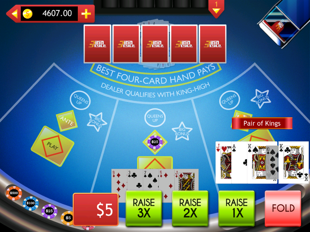 The player can place an ante bet, a "Queens Up" bet and a "Big Bonus" bet or all. Five playing cards are dealt to the player, while the dealer is dealt five cards face down. Both the player and the dealer make their best four-card hands.