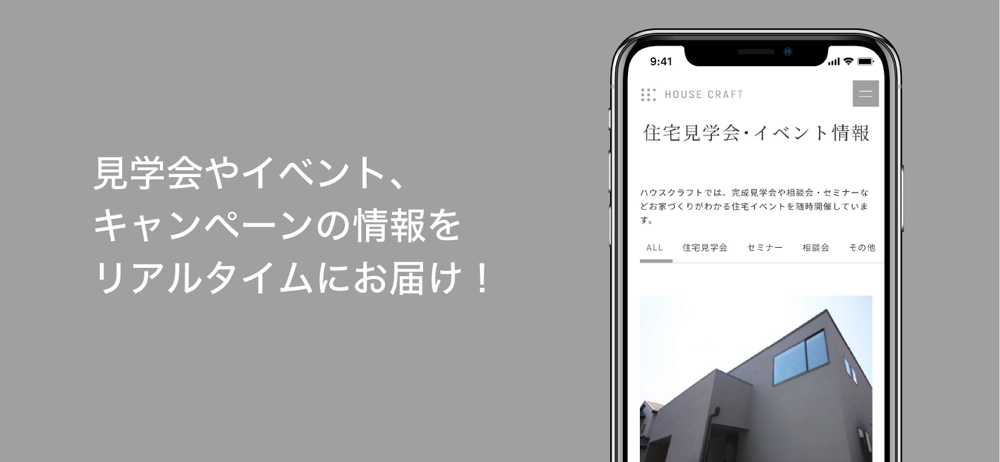 このアプリは、これから家づくりをはじめるお客様・ハウスクラフトで家づくりをしていただいたお客様に、新着情報やお役立ち情報をお届けできるようにと開発しました。