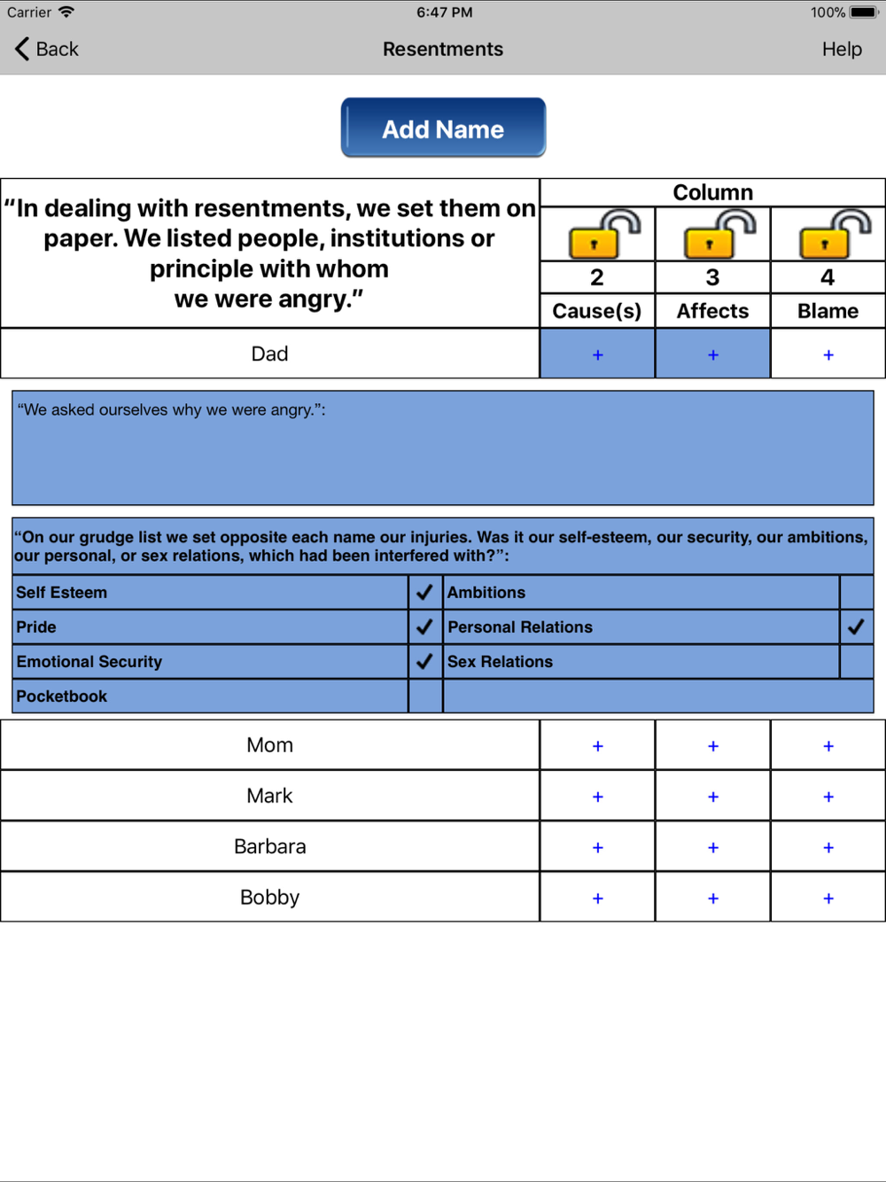 Your sponsor may want you to write out (with pen and paper) your 4th step. If that is the case, you may still utilize the app to collect your inventory information, then after printing it out, copy it over by hand.