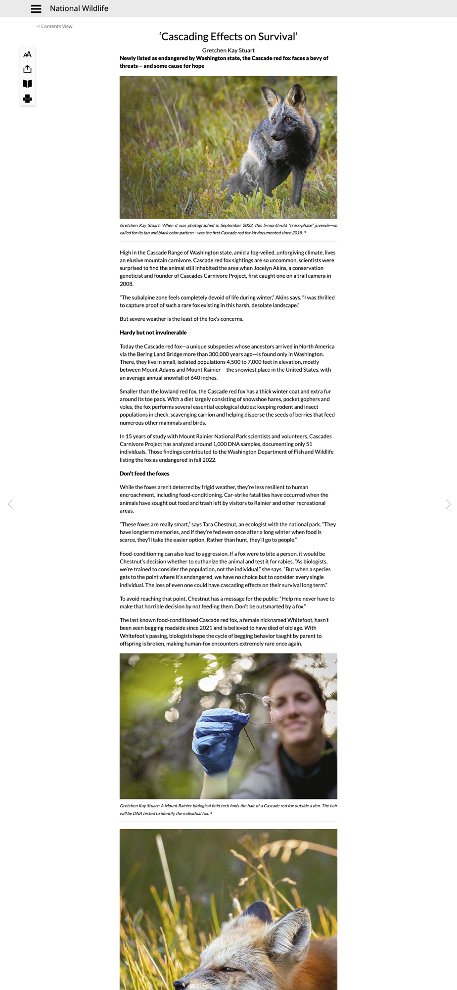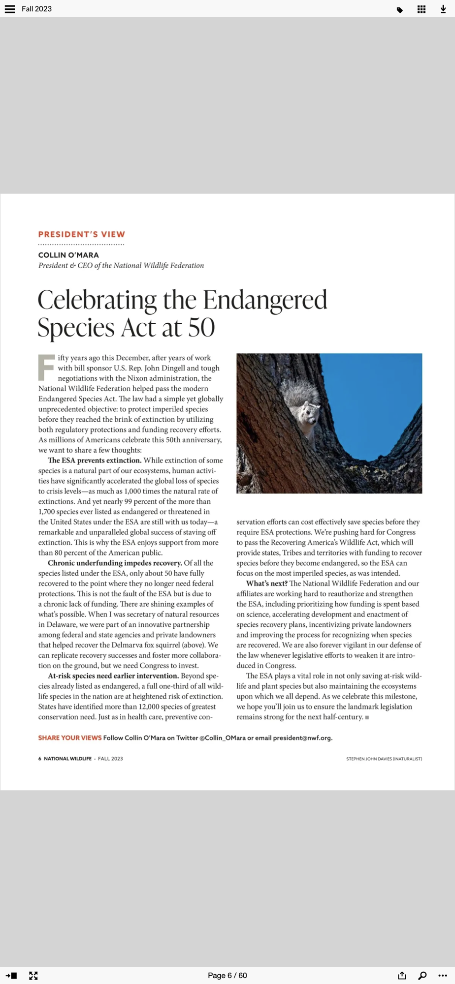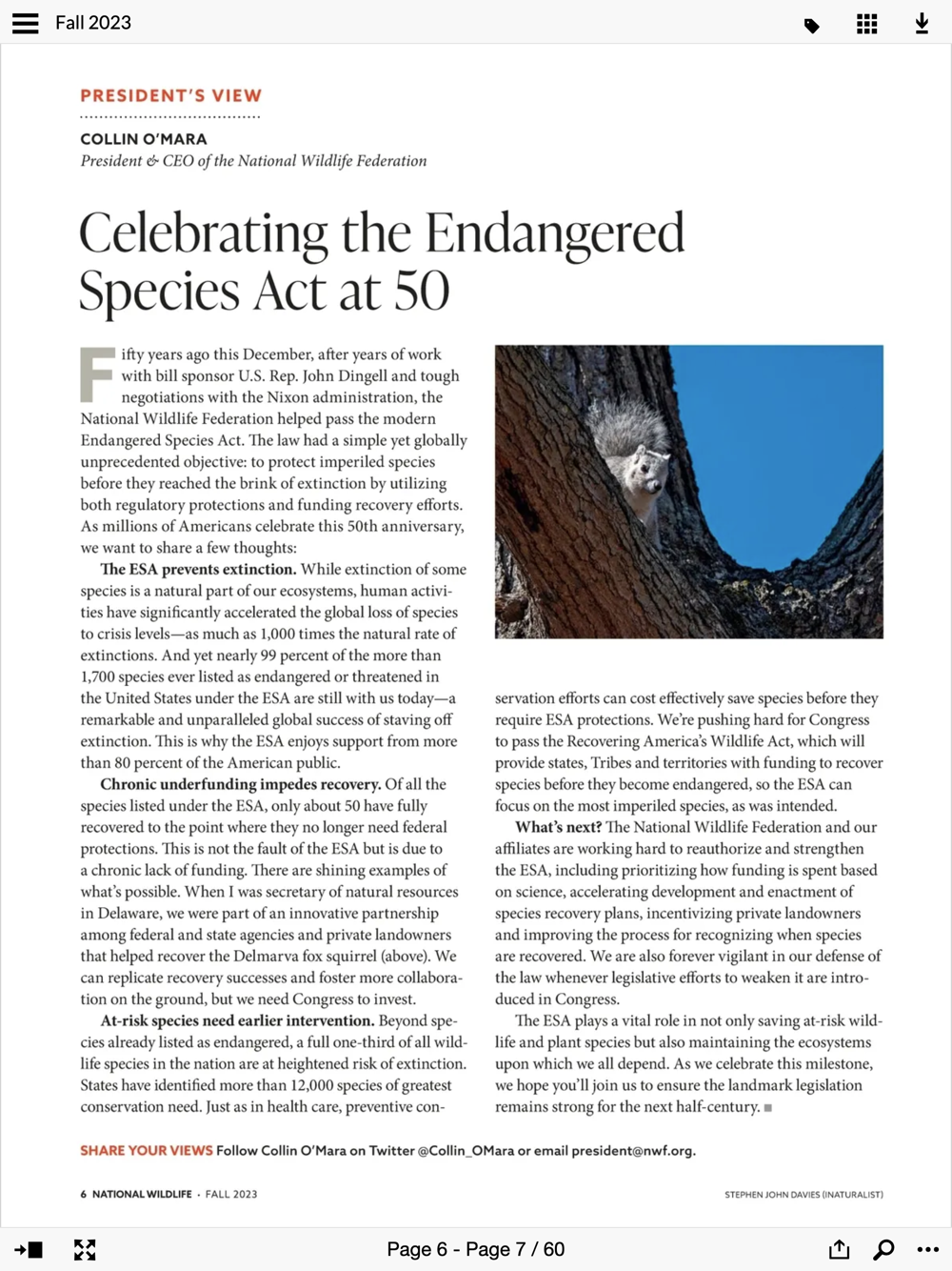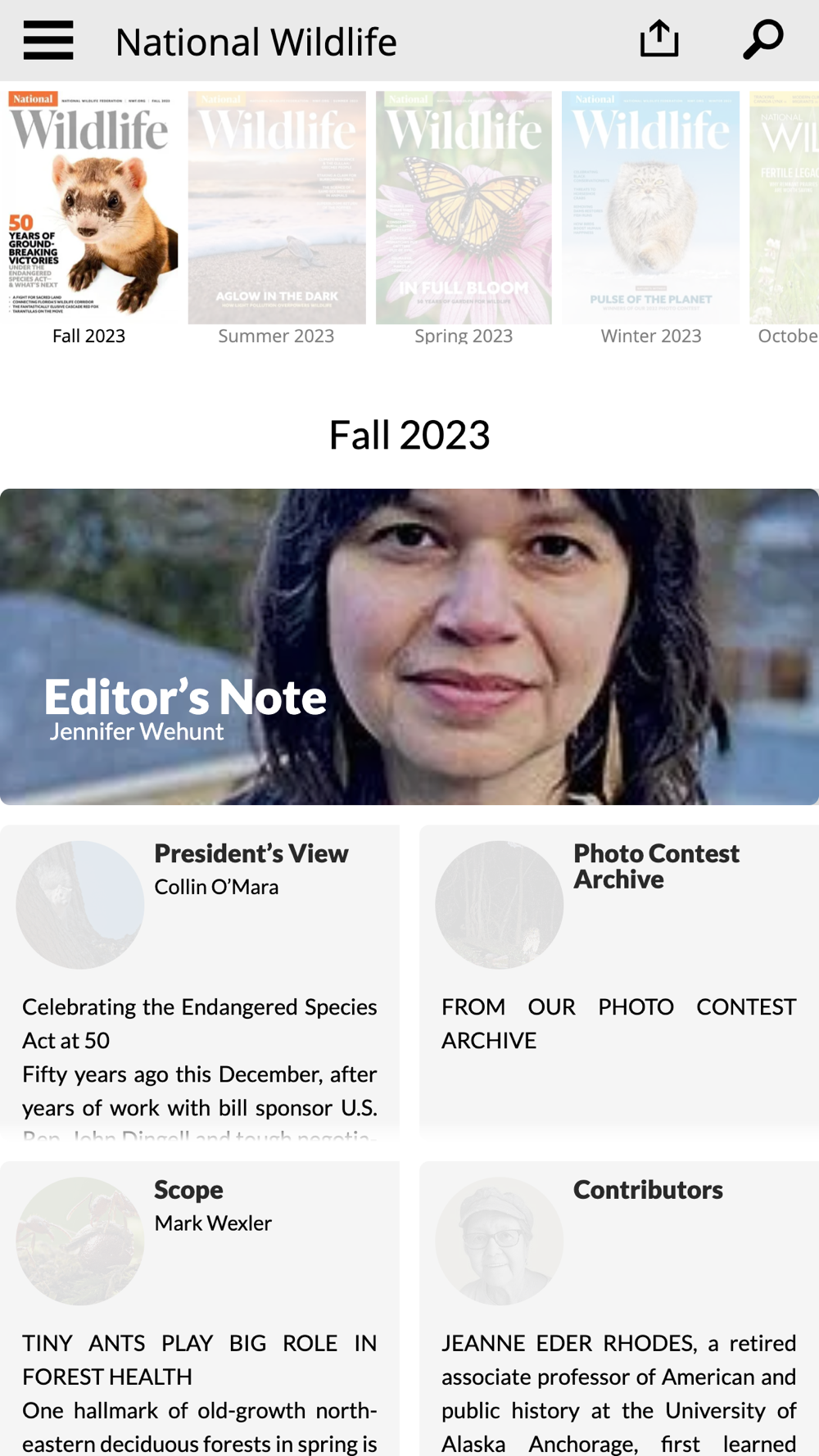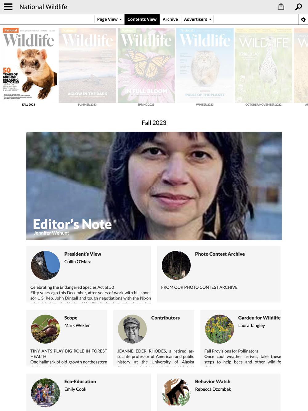National Wildlife is an inspiring, award-winning bimonthly magazine that uses in-depth reporting and spectacular photography to reveal the majesty of the world’s wildlife—from far corners of the globe to your own backyard. Every issue offers riveting articles that inform, entertain, and inspire—with stunning images from the world’s best nature photographers. It gives readers the latest news about wildlife science, compelling tales of wildlife and habitat conservation, and insights into the victories and challenges of saving wildlife in a changing world. You’ll also gain valuable tips about natural gardening, birding, and using native plants to build backyard habits that sustain birds, butterflies, and other wildlife. All who receive National Wildlife magazine care about wildlife and nature—and know they can make a positive difference in sustaining both.