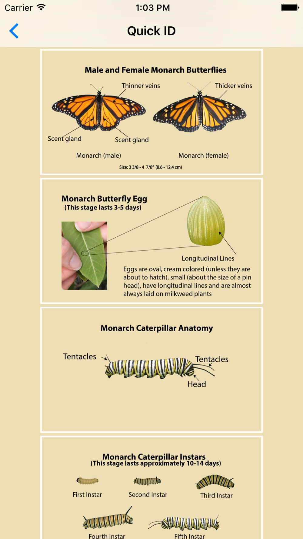 If viceroy and queen butterflies confuse you, quickly learn the differences in the "Compare" section under each butterfly. Keep up with the latest information on monarch conservation efforts and migration news by checking in daily with What's New? The feed is updated every time you open the app, so you'll always be in the loop!