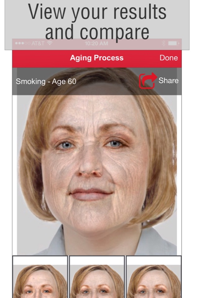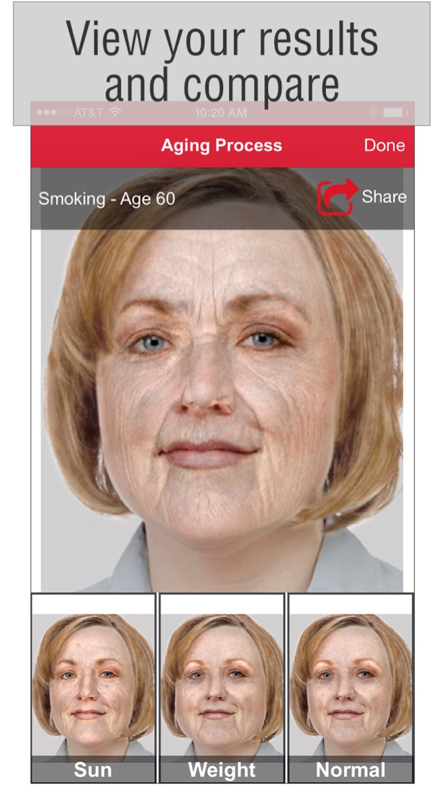 Is That Me? shows you what your face will look like 10, 20, or 30 years down the road. In just a few seconds, our predictive aging software lets you see what you’ll look like if you take good care of yourself. But it also shows you the impact of accelerated aging caused by smoking or too much sun. it also shows the future impact of weight gain caused by over-eating and lack of physical activity.