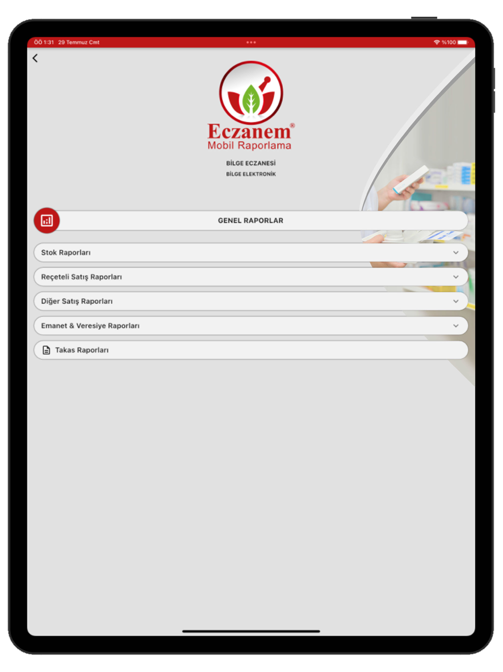 Eczanem Mobil Raporlama, Eczanem programındaki verilerinizi takip edebileceğiniz ve raporlarınızı görebileceğiniz bir uygulamadır.