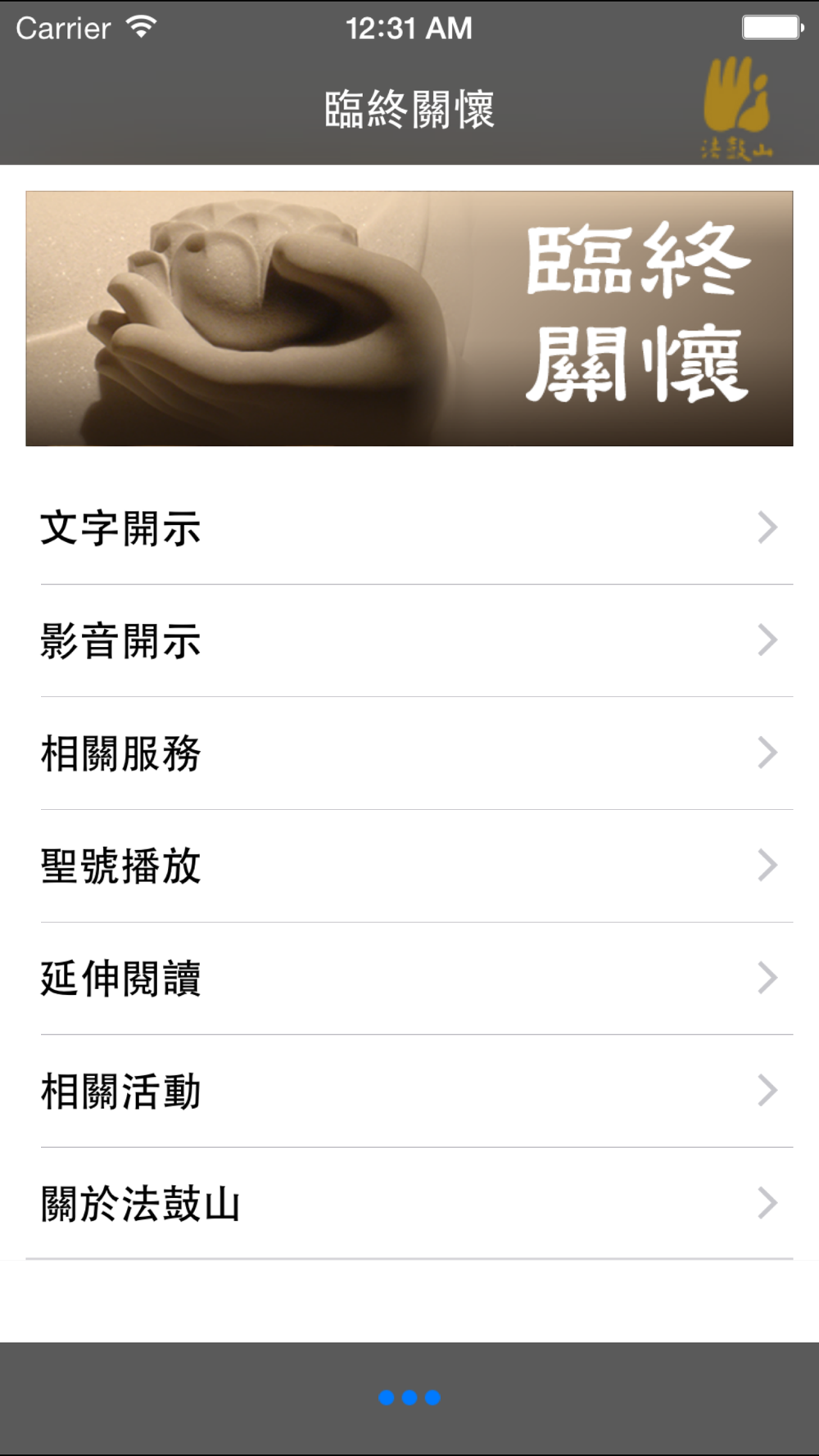 「臨終關懷」APP收錄了聖嚴法師《生與死的尊嚴》、《為什麼要做佛事》、《超度真的有用嗎》、《如何能往生淨土》等17種文字及影音開示,以平易近人的文字,介紹佛教的生死觀,讓死亡不再只有悲悽痛苦,而是教導我們在面對生死示現時,如何才能夠利益臨終的親友,更學習如何運用佛法平安幸福地走完一生,走向永遠有希望的未來,進而解脫生死苦海的束縛。