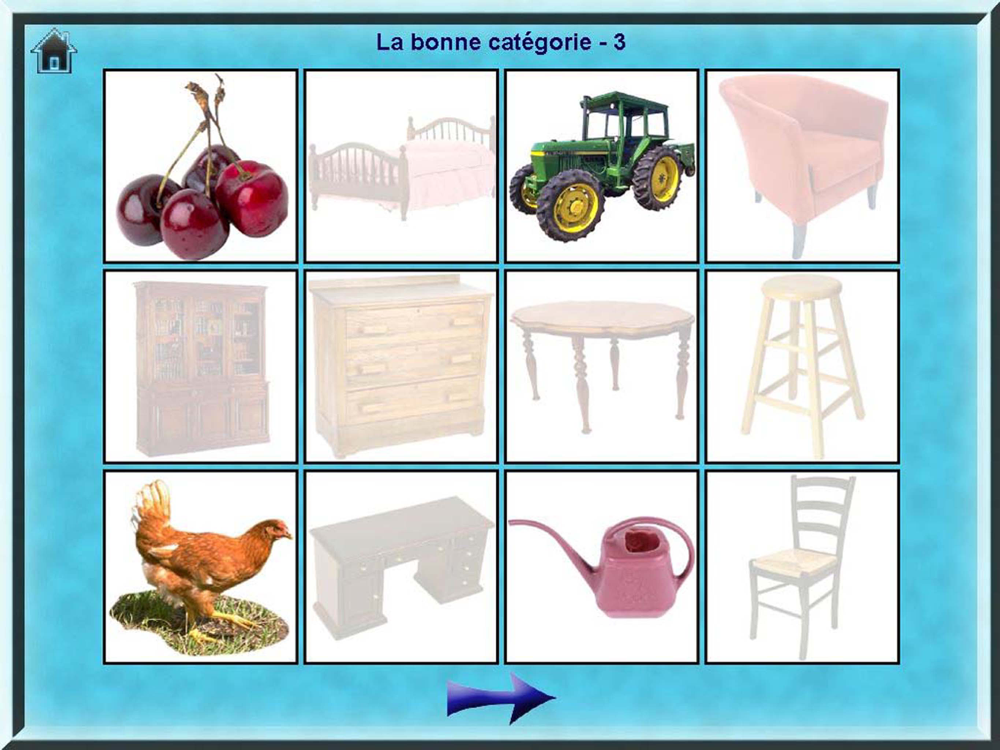 Cette application est destinée aux enfants à partir de 3 ans mais peut être proposée aux plus grands et aux adultes en difficulté du fait de sa présentation. Elle est conçue pour organiser et développer le stock lexical. Il s'agit de sélectionner parmi 12 toutes les images appartenant à une même catégorie. Celle-ci peut être découverte par l'utilisateur ou donnée oralement (6 exercices de difficulté croissante, plus de 150 photos).