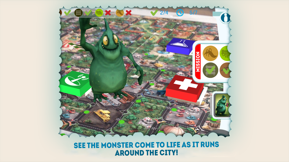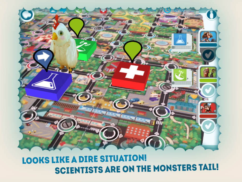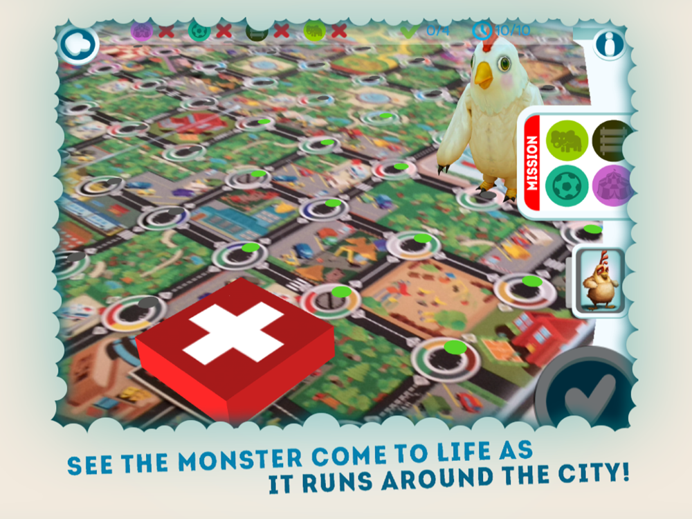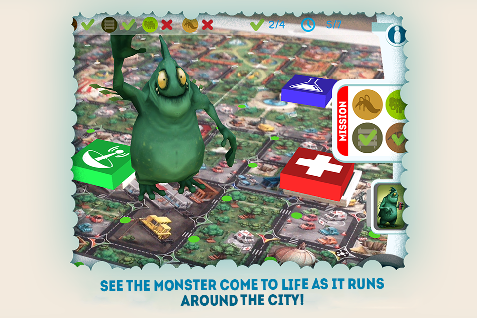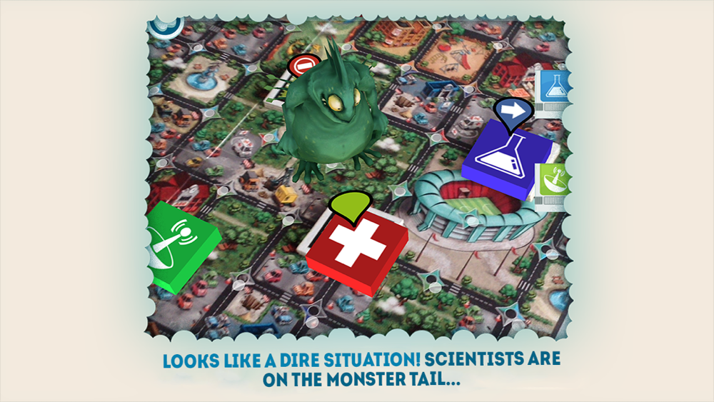 “Roar! Catch the monster” is the very first fully hybrid game that integrates Augmented Reality and a boardgame into one fantastic piece of fun. A hidden monster moves over the colorful city with a digital pawn, trying to escape the vigiliant scientists on their quest to catch him. And while the elusive monster hides between the buildings, scientists have to listen to all the sounds of the city to try their best in pinpointing his location. Before it is too late, that is!