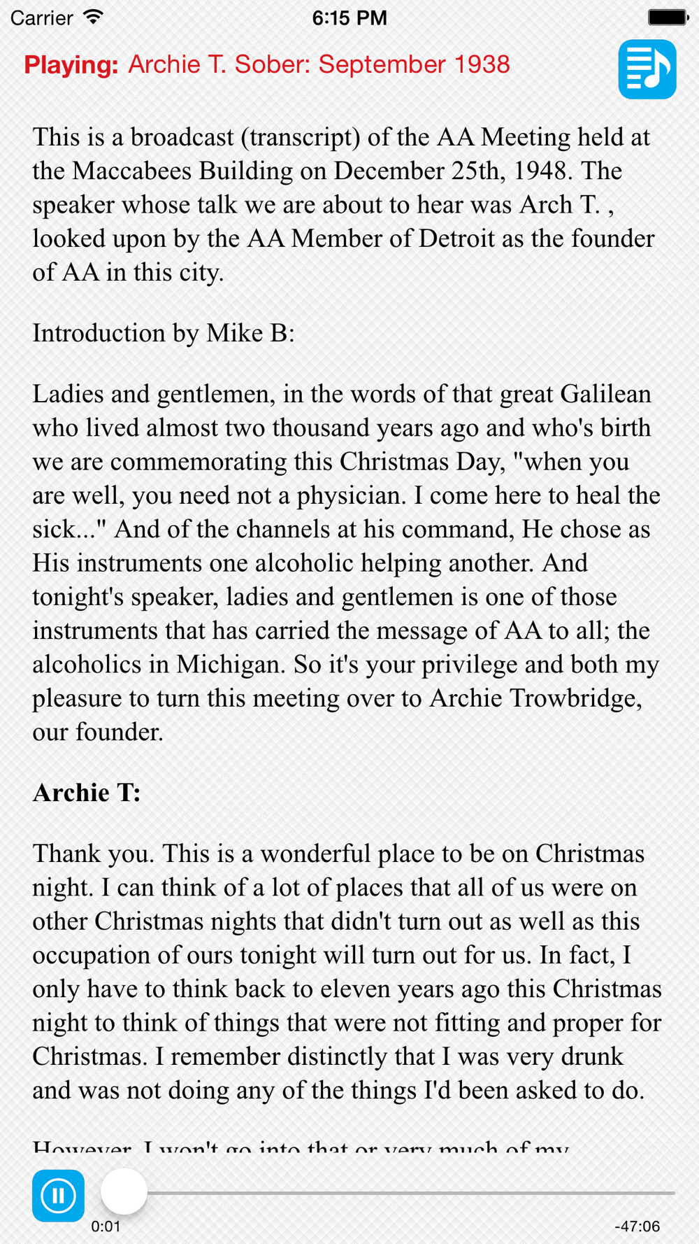 Our starting point on this project is to provide the talks of early and influential members who are featured in the 1980 "Dr. Bob and the Good Oldtimers".Transcripts are available only for the fist track by Archie T.