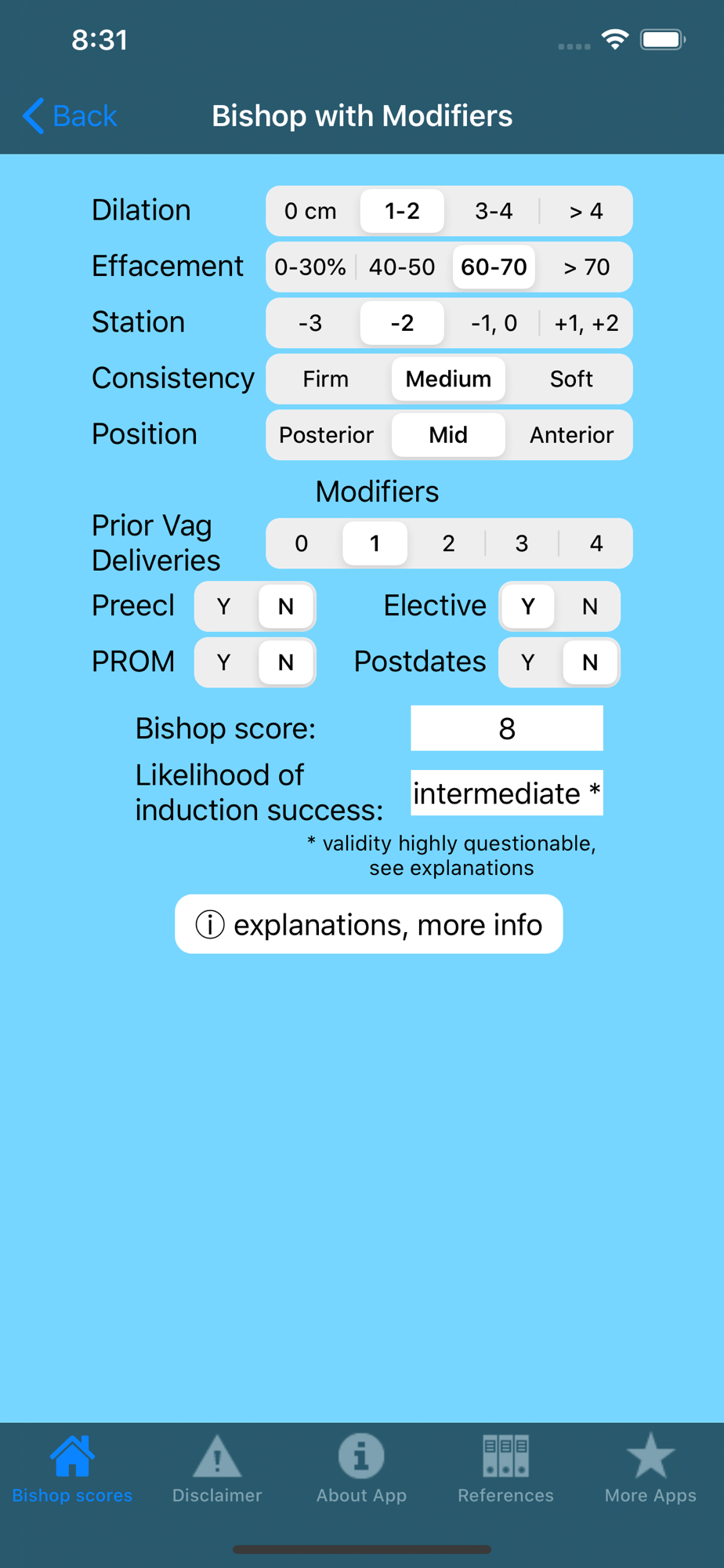 The Bishop Scores app presents three different scoring schemes which help a clinician decide whether proposed induction of labor is likely to be successful and consider whether cervical ripening is warranted. The three schemes are the classic original Bishop Score from 1964, the Bishop Score with Modifiers from Hughey in 1976, and the recent statistically rigorous Simplified Bishop Score of Laughon in 2011. Discussion, explanations, and references are included.