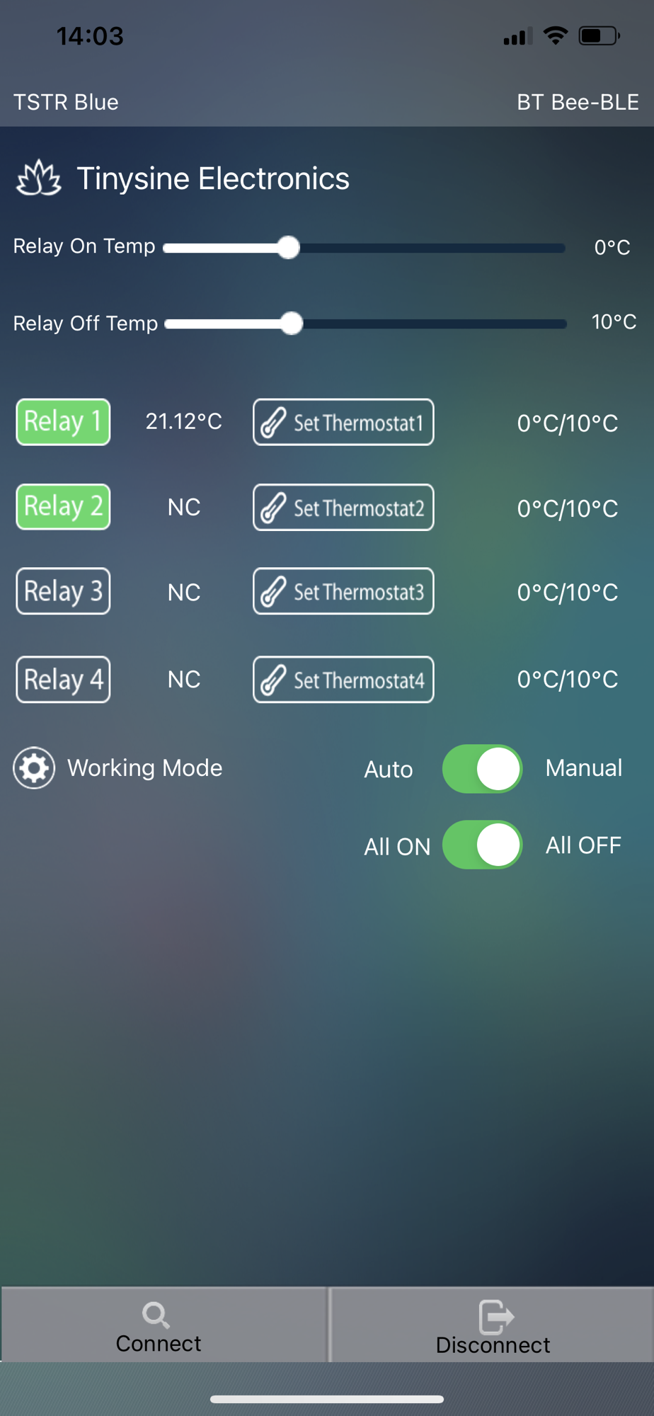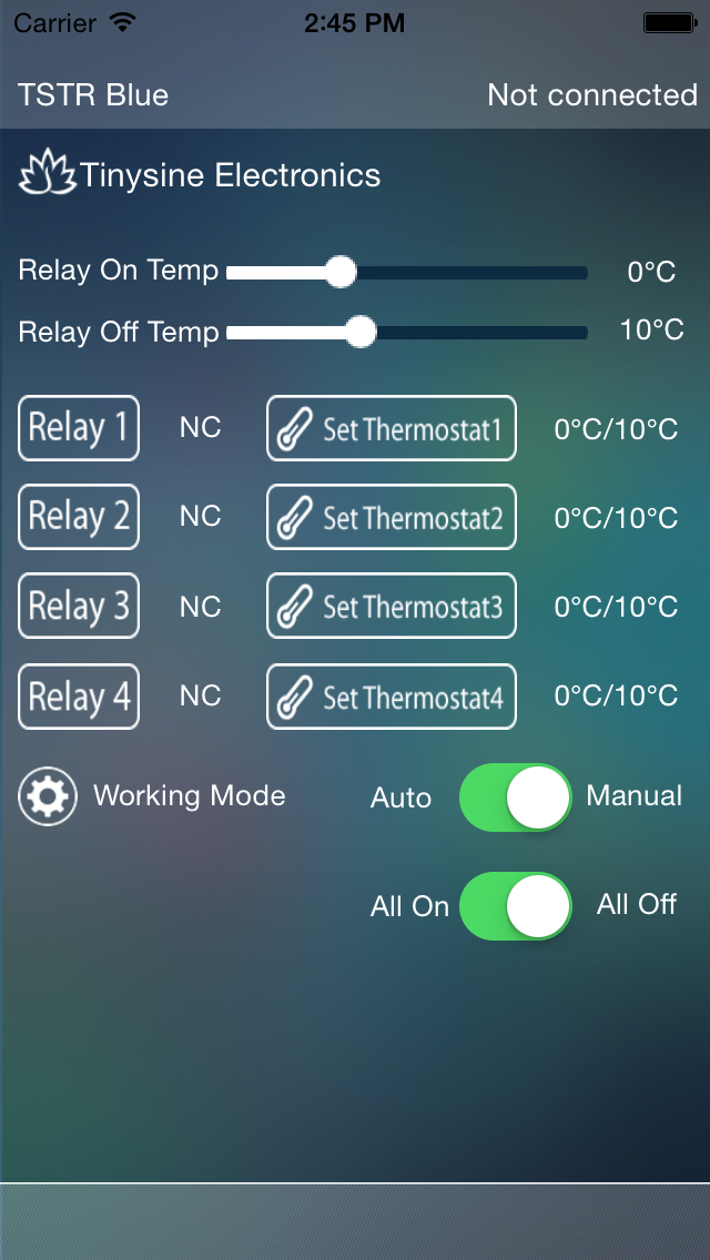 This is the APP for Tinysine TSTR series Bluetooth relay board.The TSTR series relay board have an OLED display and 4 temperature sensor input ports. It can be controlled by our phones via Bluetooth or WiFi,you can also set 4 threshold value to let the corresponding relay ON/OFF related with the temperature.