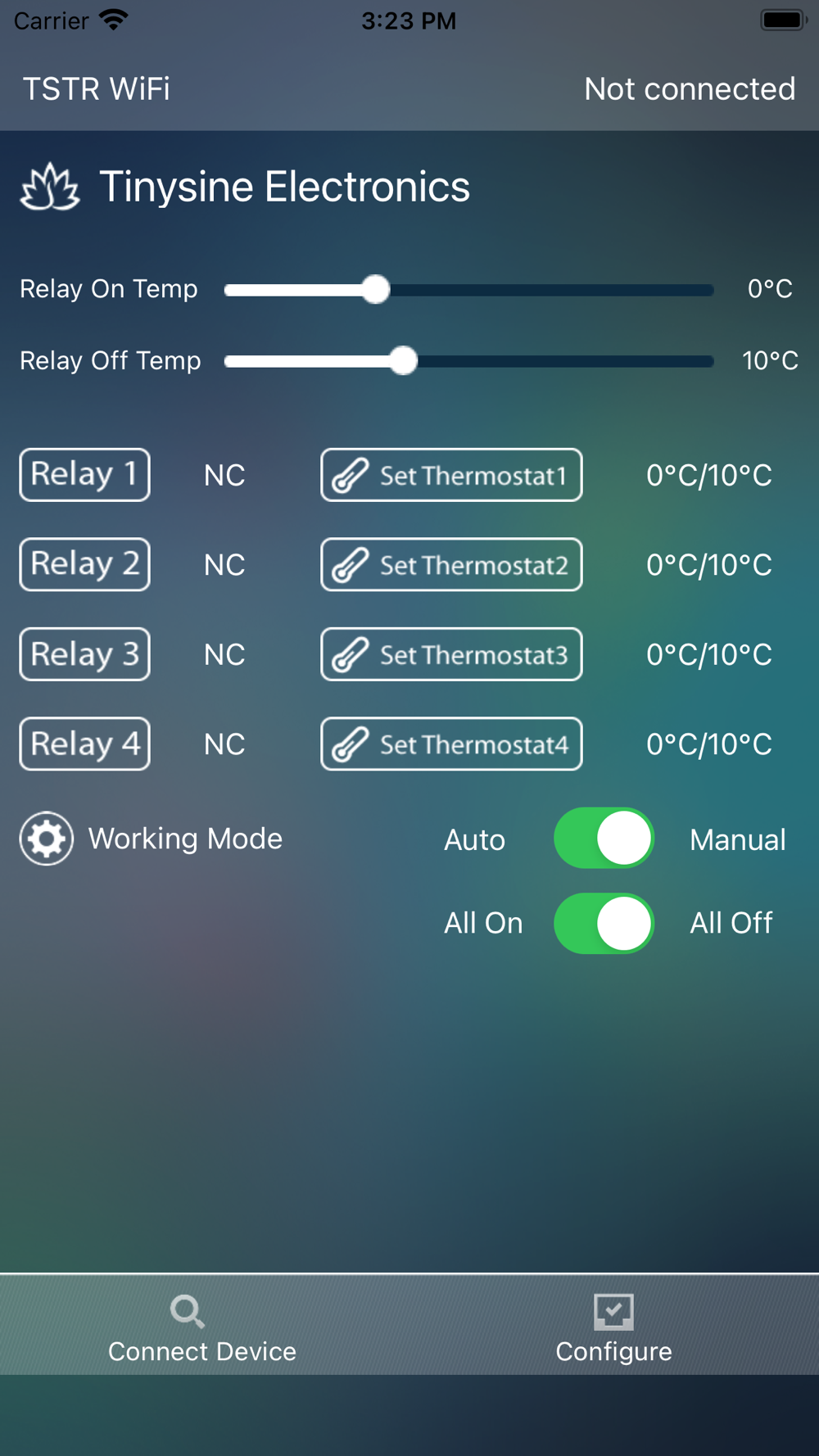 This is the APP for Tinysine TSTR series Bluetooth relay board.The TSTR series relay board have an OLED display and 4 temperature sensor input ports. It can be controlled by our phones via Bluetooth or WiFi,you can also set 4 threshold value to let the corresponding relay ON/OFF related with the temperature.