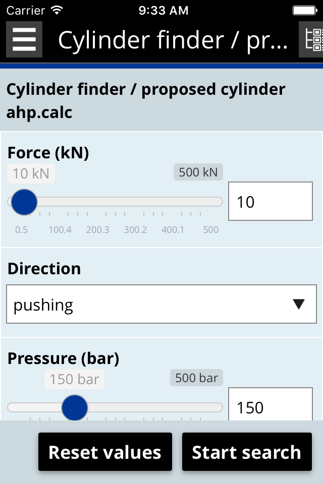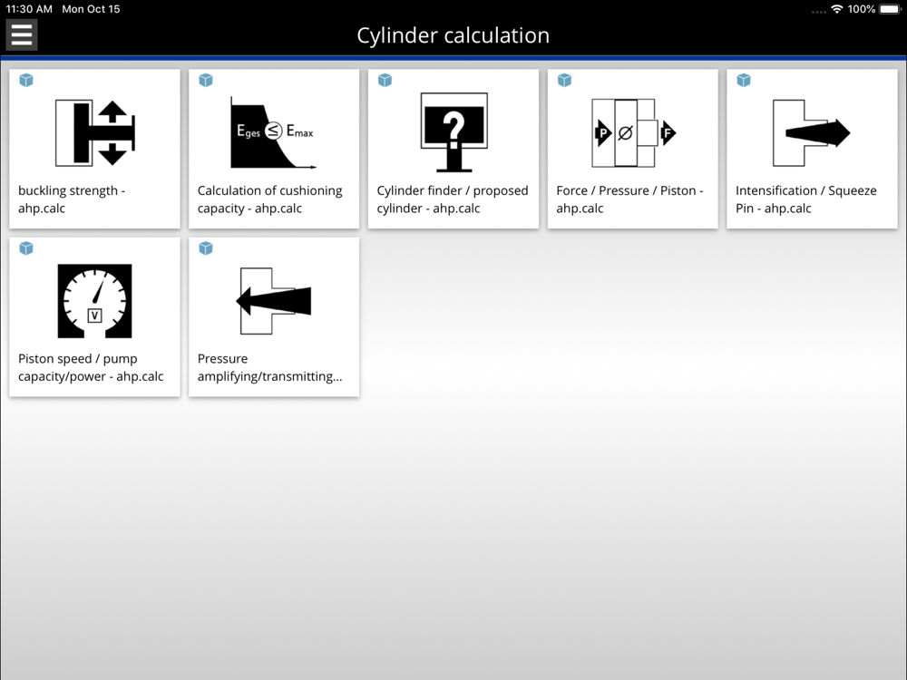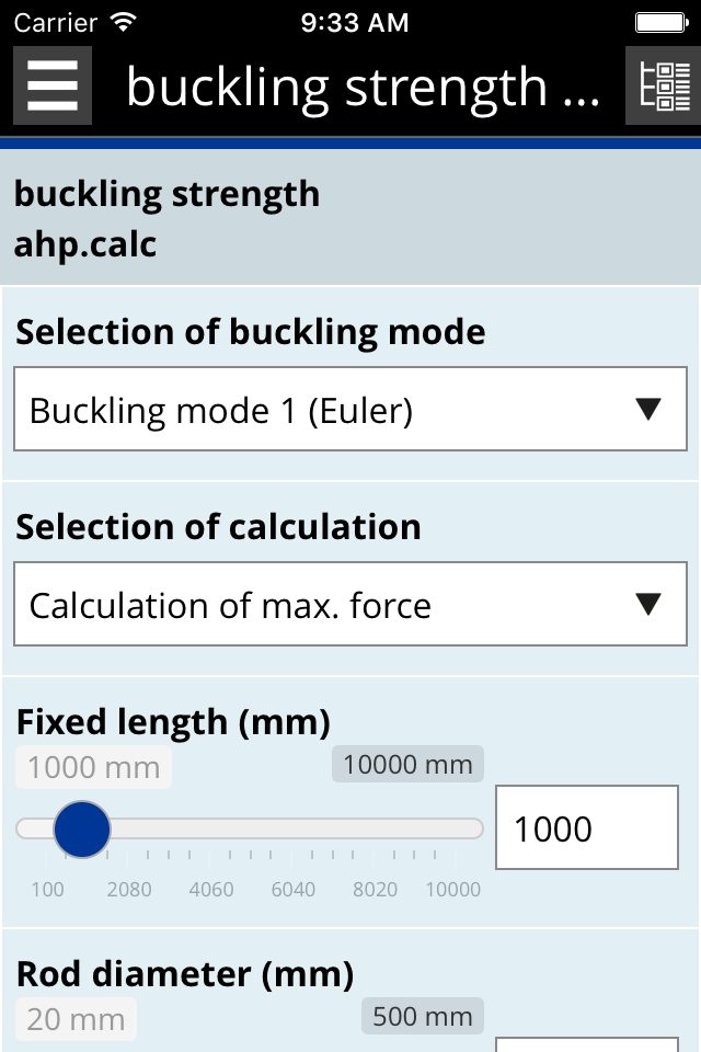 The hydraulics calculator makes it easy to calculate hydraulic cylinders and design layouts for hydraulic systems in a simple and intuitive way. The required piston diameter or pressure can be calculated in a flash, along with the buckling strength using the Euler formula.