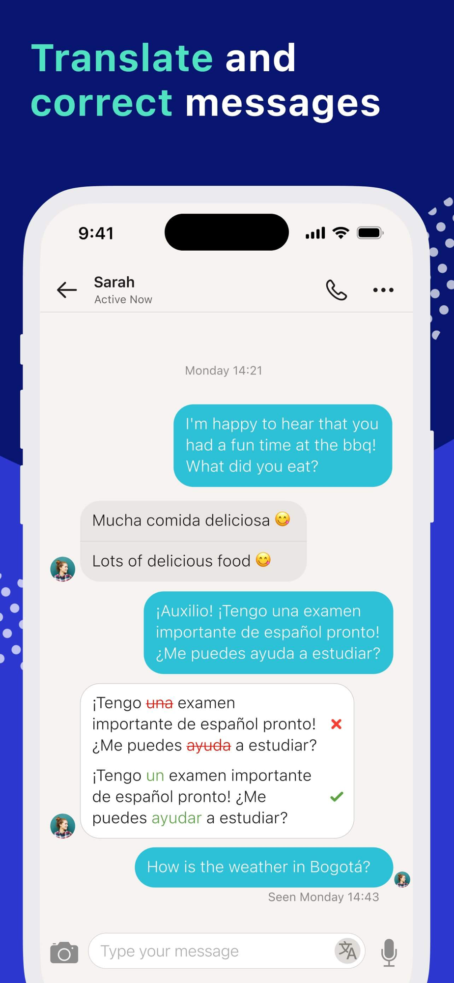 For the times when you’re struggling to find the correct words, our in-app translation feature helps you compose a message or translate an incoming one.