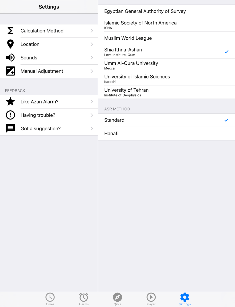 * Choose from 14 built-in full Azan alarms, or choose a song from your iTunes Music Library.