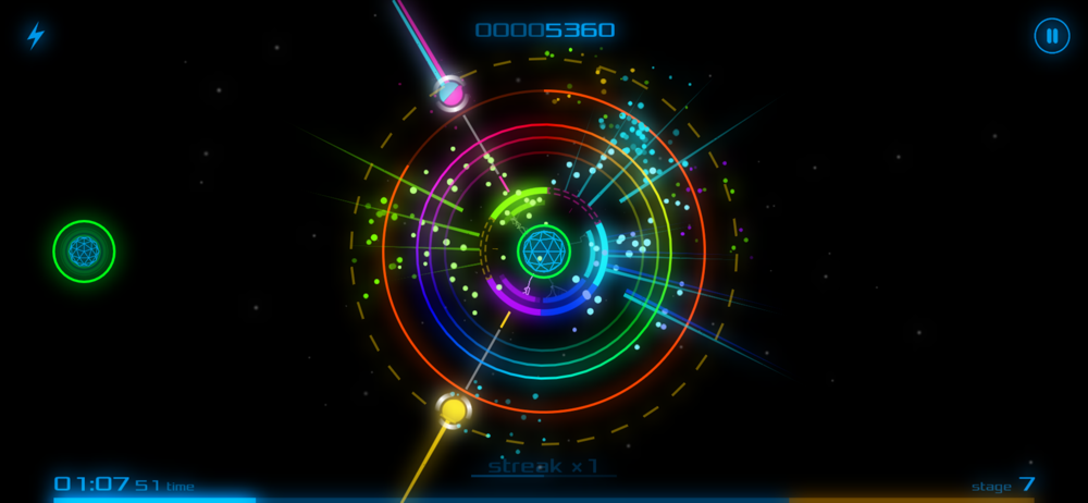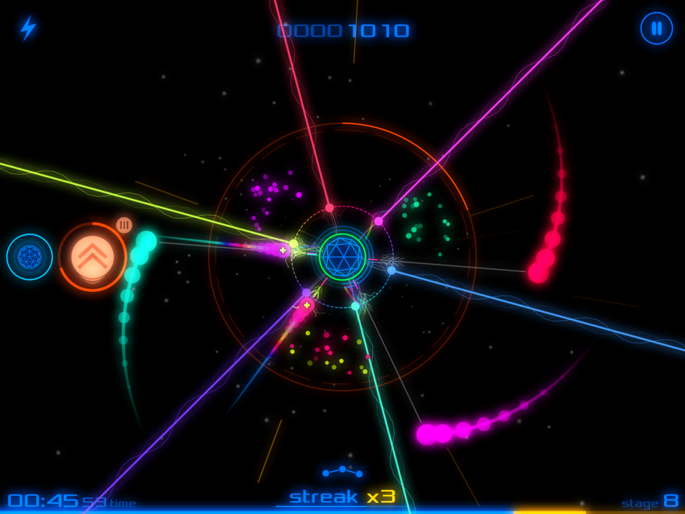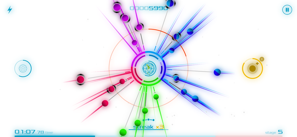 • Protect the Core from being hit by colorful orbs by intercepting them with the Shield.