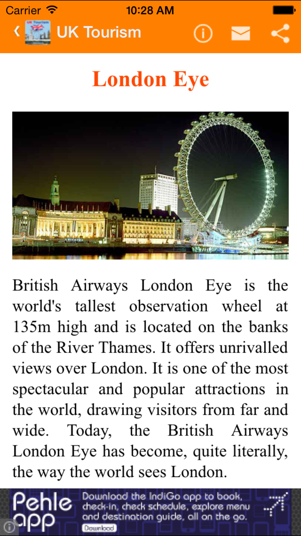Ours is a humble attempt to make you aware of the most essential and useful information about UK in brief and at most reasonably available to you at your finger tips. This app also helps you most with images and brief description of the places of tourist interest. Since it is integrated with Social media such as Face Book, Twitter and Emails you can share your live coverage of your trips with your friends and relatives. One of the main advantage of this app is that it is very simple and easy to use. It saves your time a lot and no doubt will be a good companion of yours in your travel.