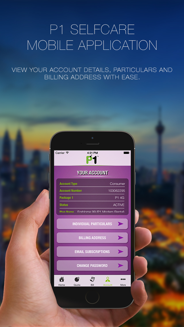 * Account: Displays account details, particulars and billing address. P1 subscribers can also implement their password change plus change their personal details.