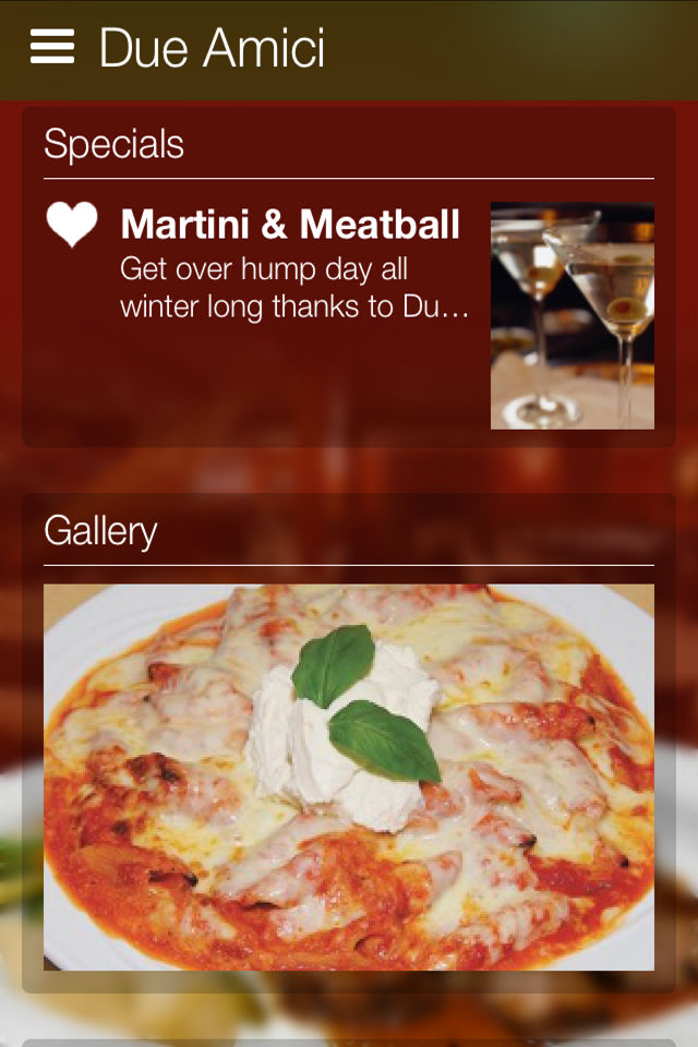 The Due Amici app is free and you will begin receiving information soon after it is downloaded. Watch for push notification specials, promotions and up-to-date information.