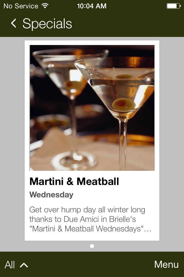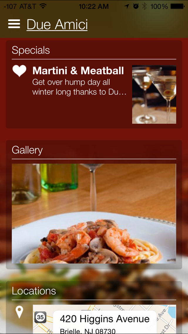 Due Amici, an upscale Italian restaurant in Brielle, New Jersey invites you to download their new app. Scroll through and check out their menus, photos, promotions, videos and more. Due Amici’s app will keep you up to date on seasonal menu offerings, events and entertainment and exclusive on-line specials – all at your fingertips.