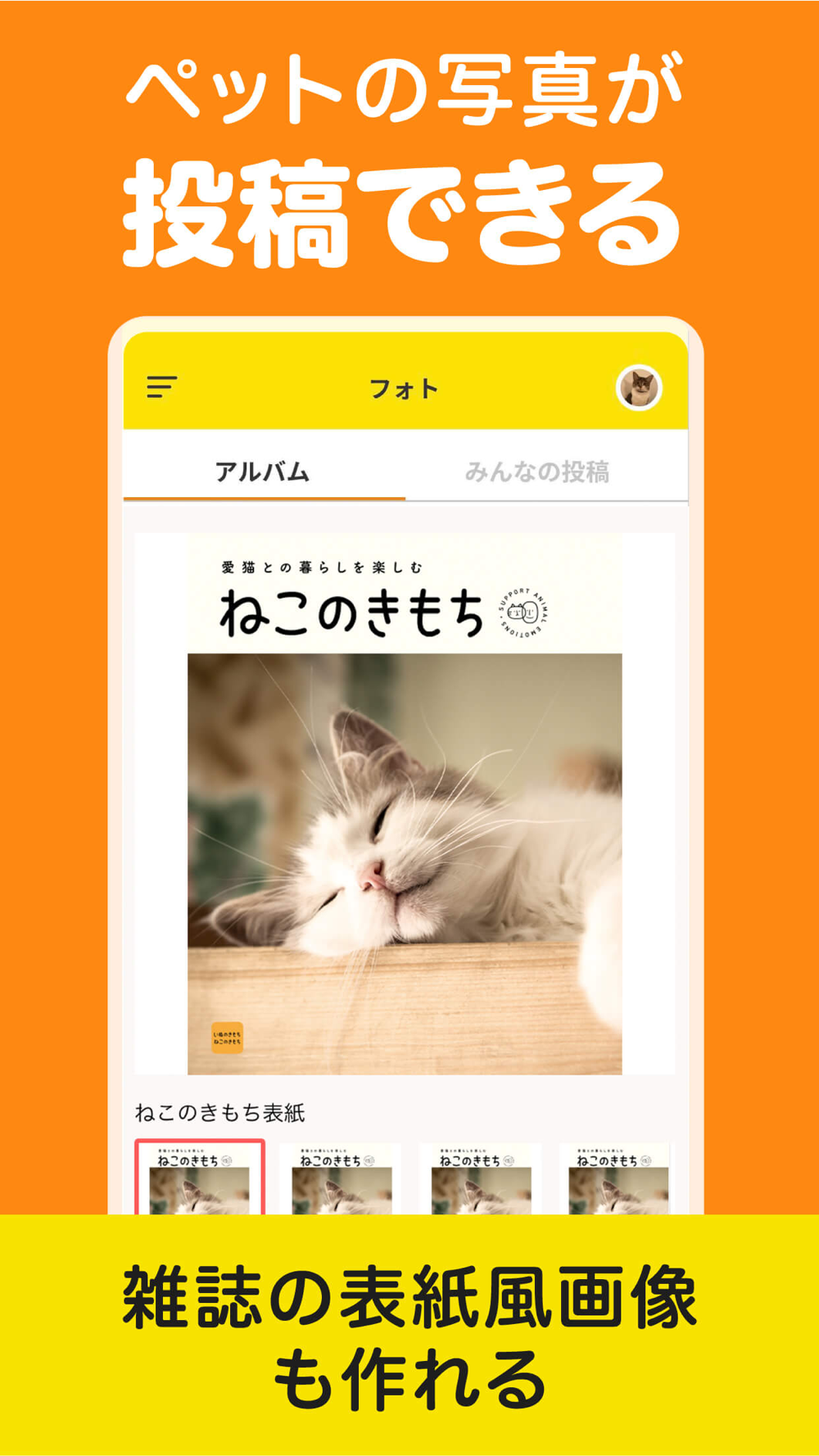 写真を投稿すると月ごとに「アルバム」に整理されます。いつ投稿したかがわかるので、成長を振り返ることができます。さらに、各種スタンプで装飾が可能!「いぬのきもち」「ねこのきもち」の表紙風フレームもありますので、ぜひご利用ください。