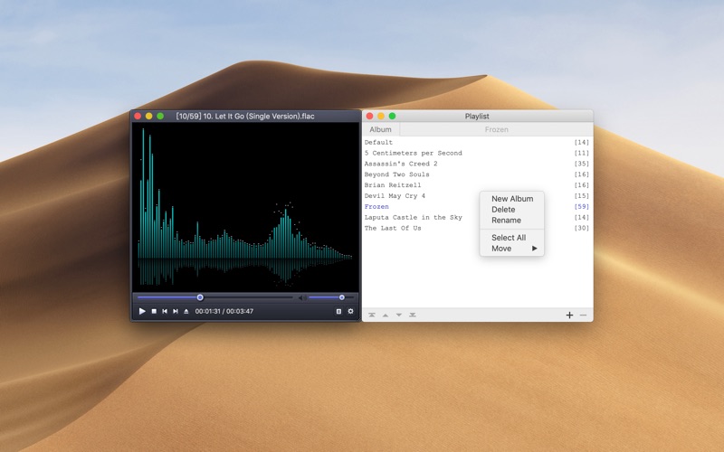 • Editable playlist (Command-P): Add, Delete, Rename, Sort, Play