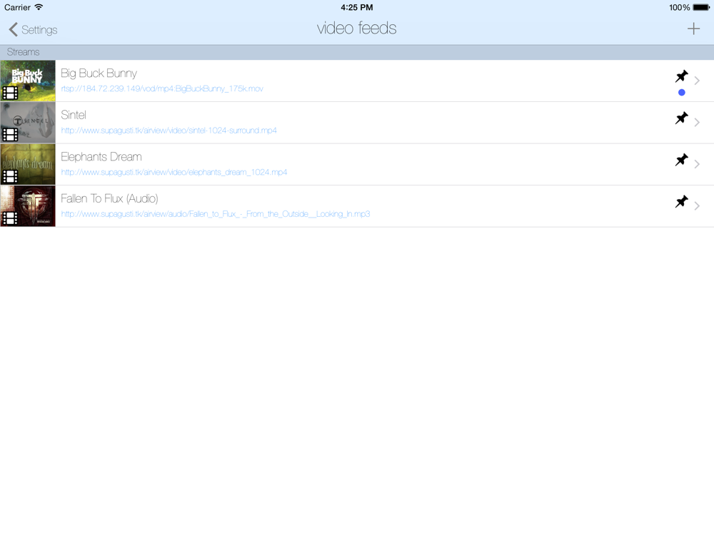 But you can use AirView also for streaming video from several other sources to your iPhone. Free sample video feeds are shipped with your app. There are several configuration options to fit your needs. As AirView! is based on FFmpeg it supports video over various transport ways such as: http, https, mms, mmsh, rtmp, rtsp and much more.