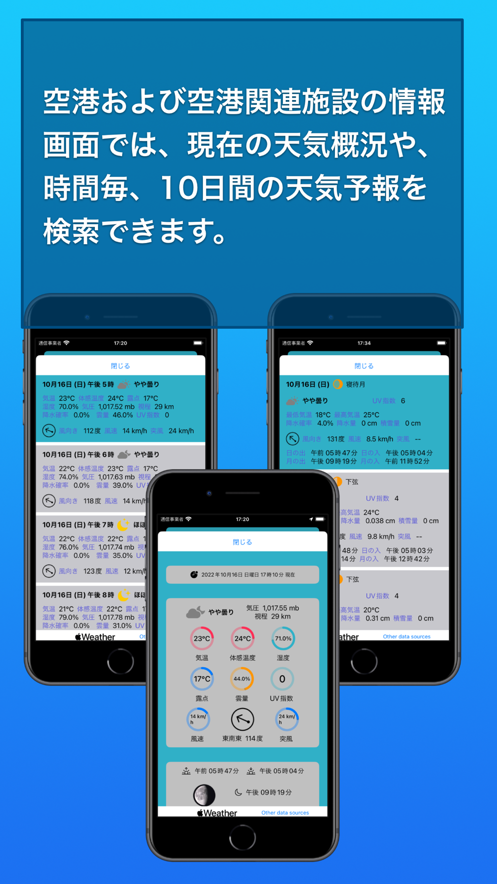 ・空港付近の現在の天気概況と時間毎、10日間の天気予報。
