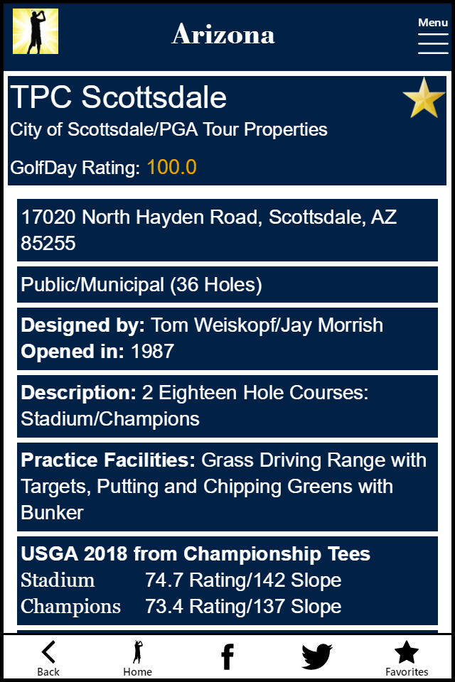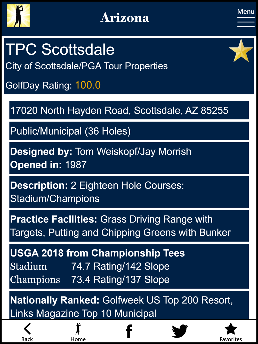 GolfDay Arizona includes over 300 courses in the state of Arizona, with a GolfDay Rating and proximity search making it easy to find a great course near you or where you plan to be. Listings also include rates, booking links, course detail, golf league and junior golf information, mapping/directions and local weather. Don’t waste your valuable time at a Dog Track!