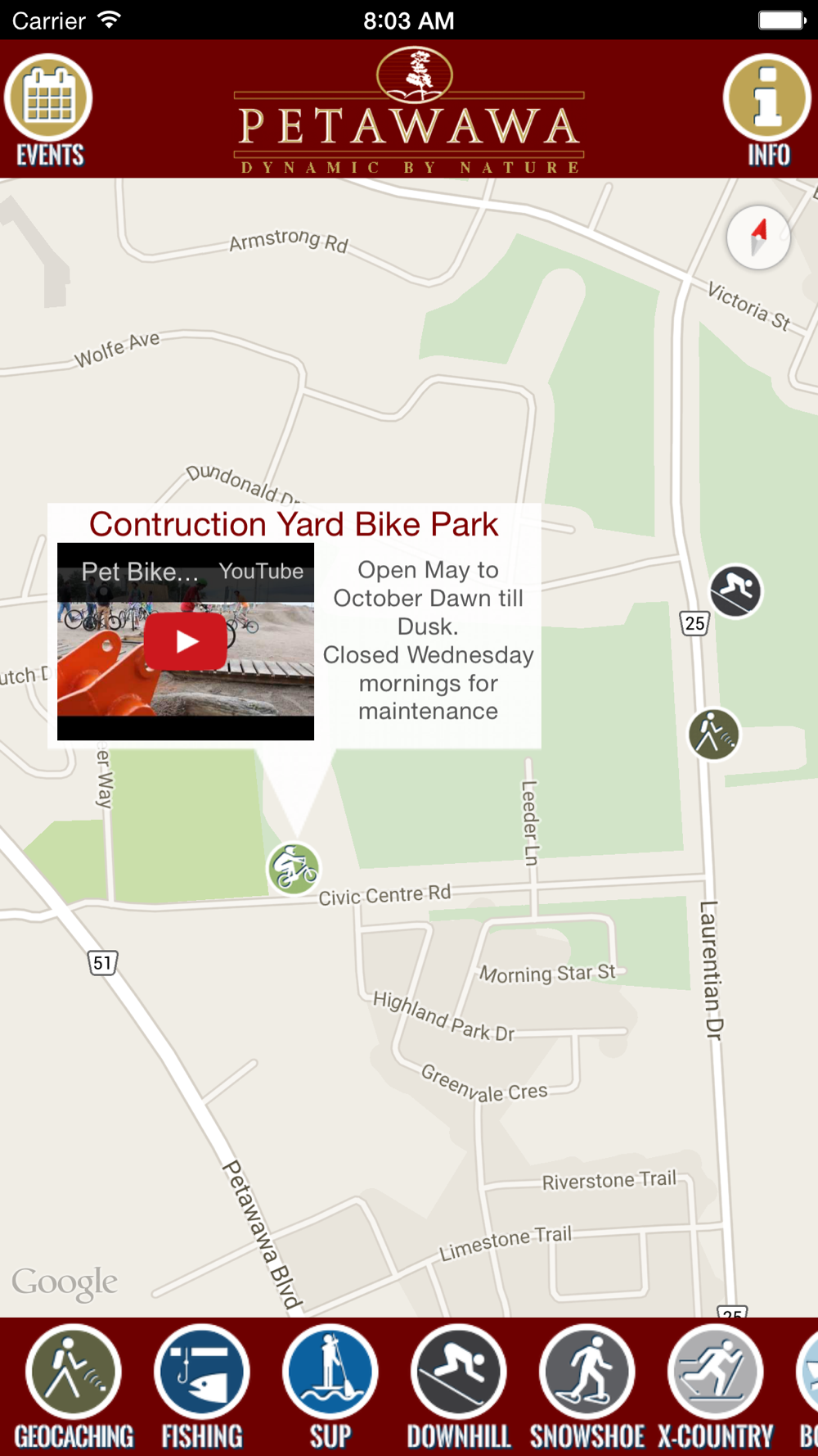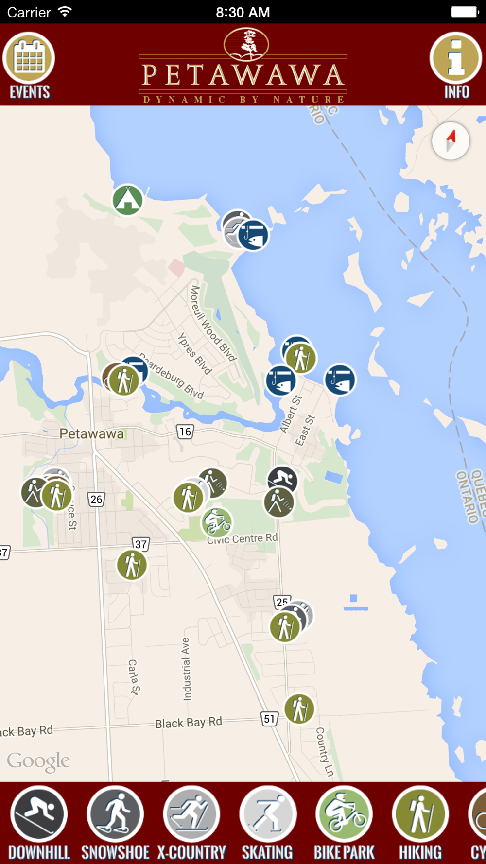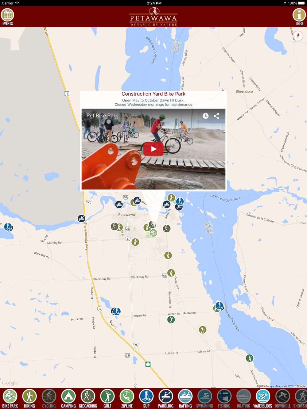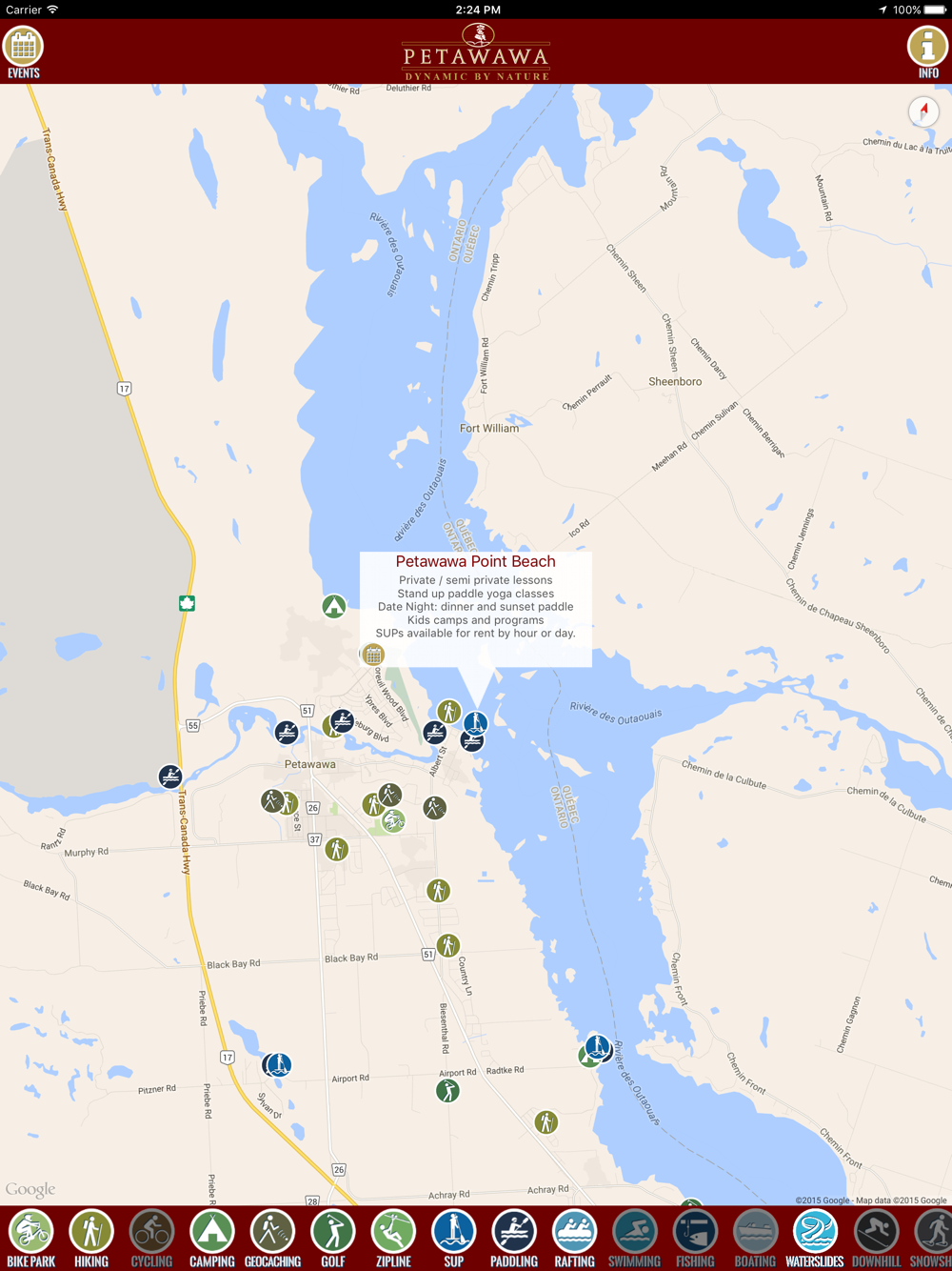 Petawawa's Guide To Outside allows you to take advantage of everything that the area has to offer. Find hiking, cycling, skiing and snowshoe trails, paddling, SUP and rafting put-ins, golf courses, beaches, campgrounds and all of the other activities in the surrounding area. Enjoy fishing for bass, pike, trout and other species on miles of open water, or head to the area's other attractions such as the heritage village, ski hills, waterslide park and ziplines.