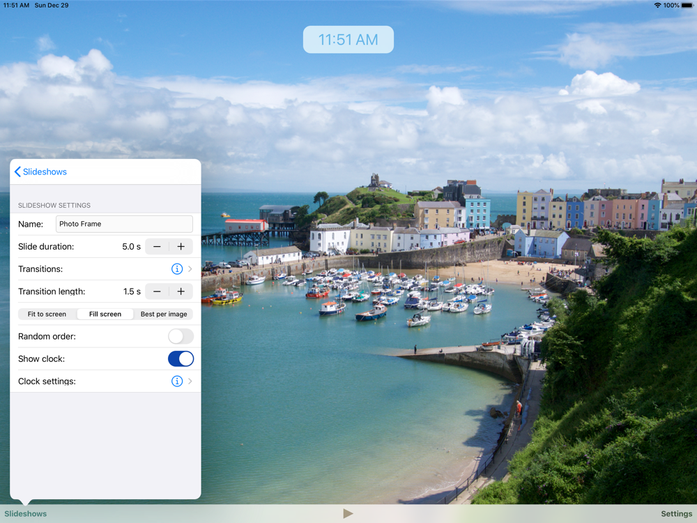 Note: Slideshow and clock settings are available on a per slideshow basis, by tapping the "i"-icon for each slideshow.