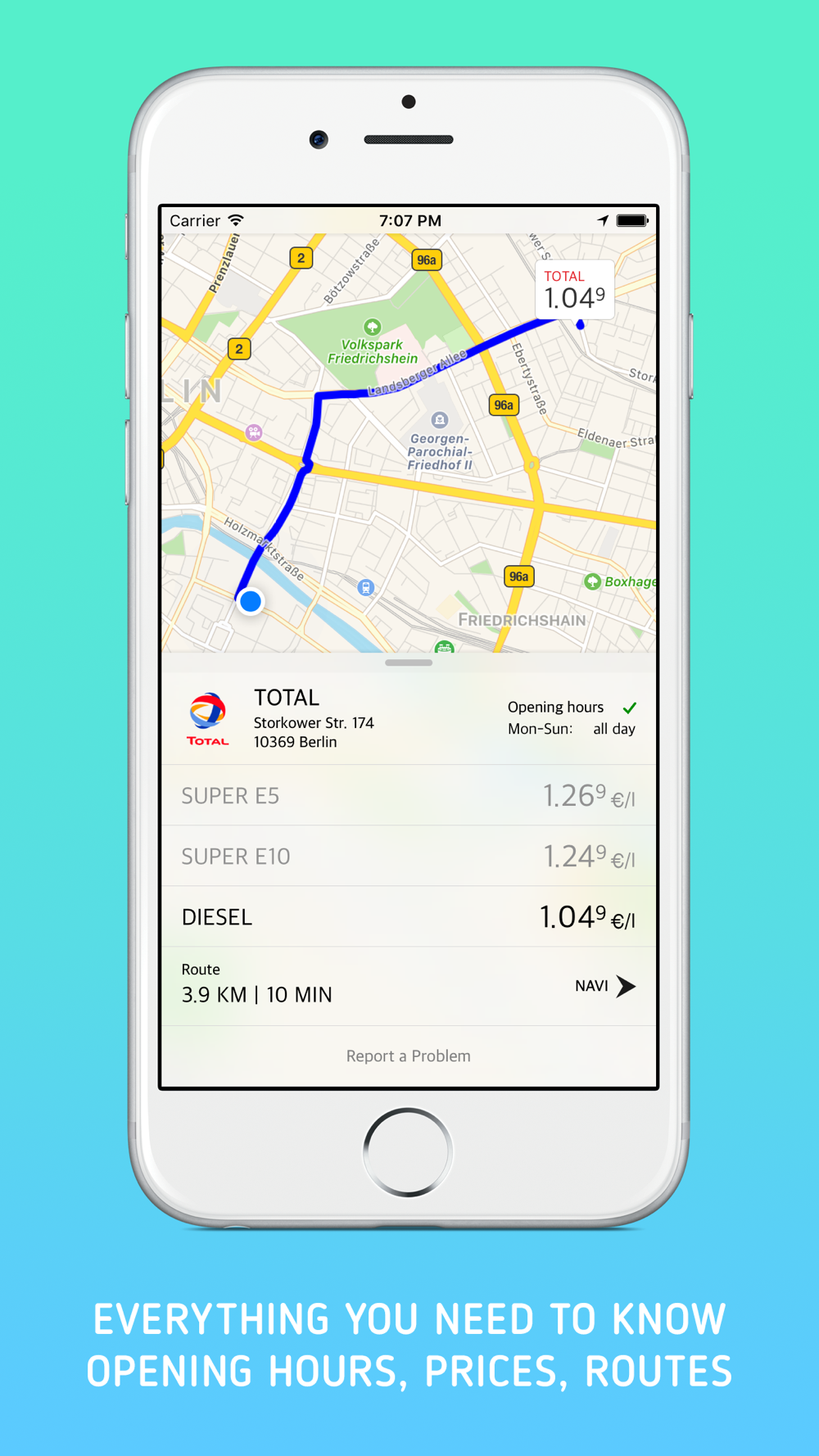The app provides you with the opening hours and addresses of all registered gas stations.